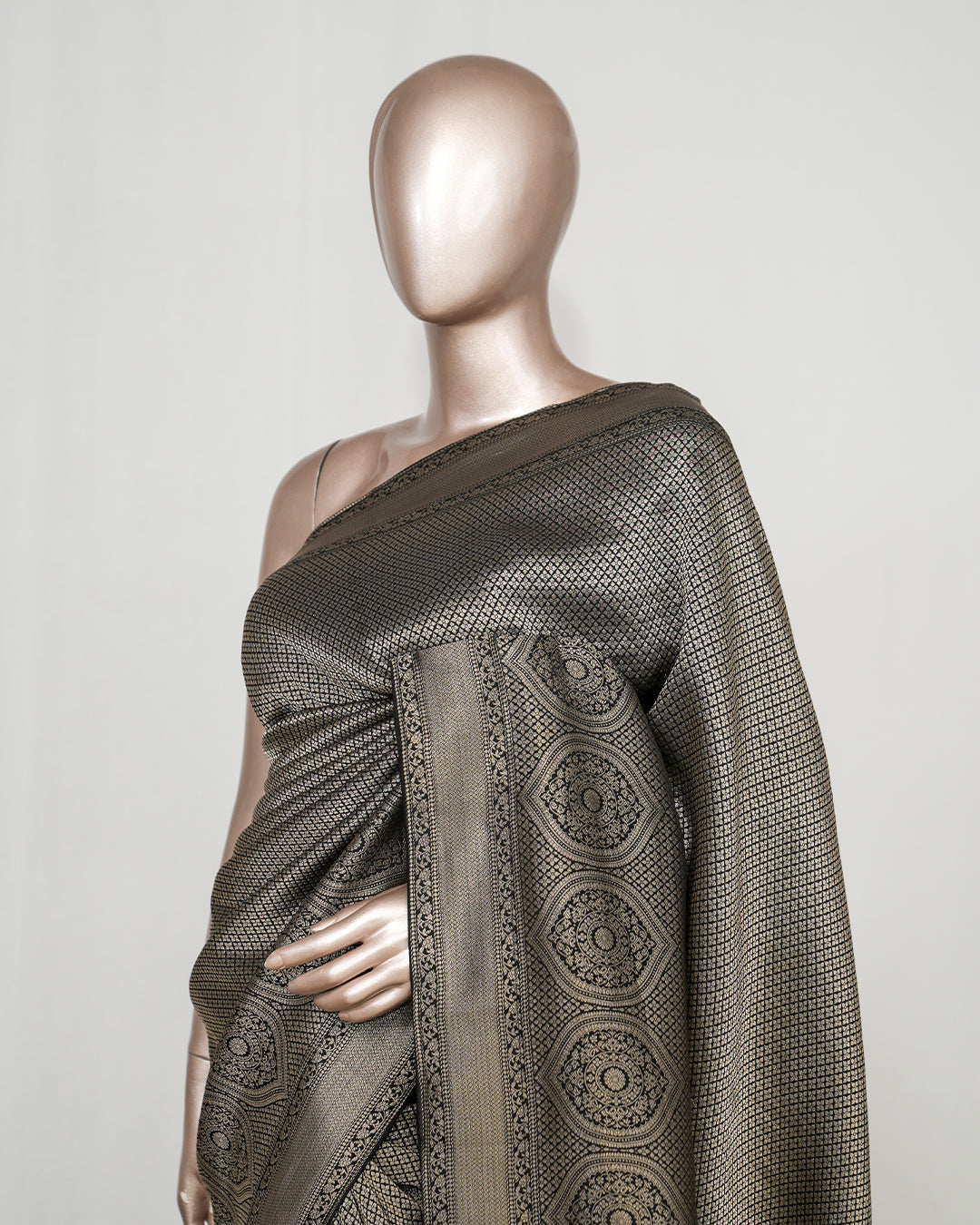 • Richly detailed pallu with traditional circular Banarasi motifs
