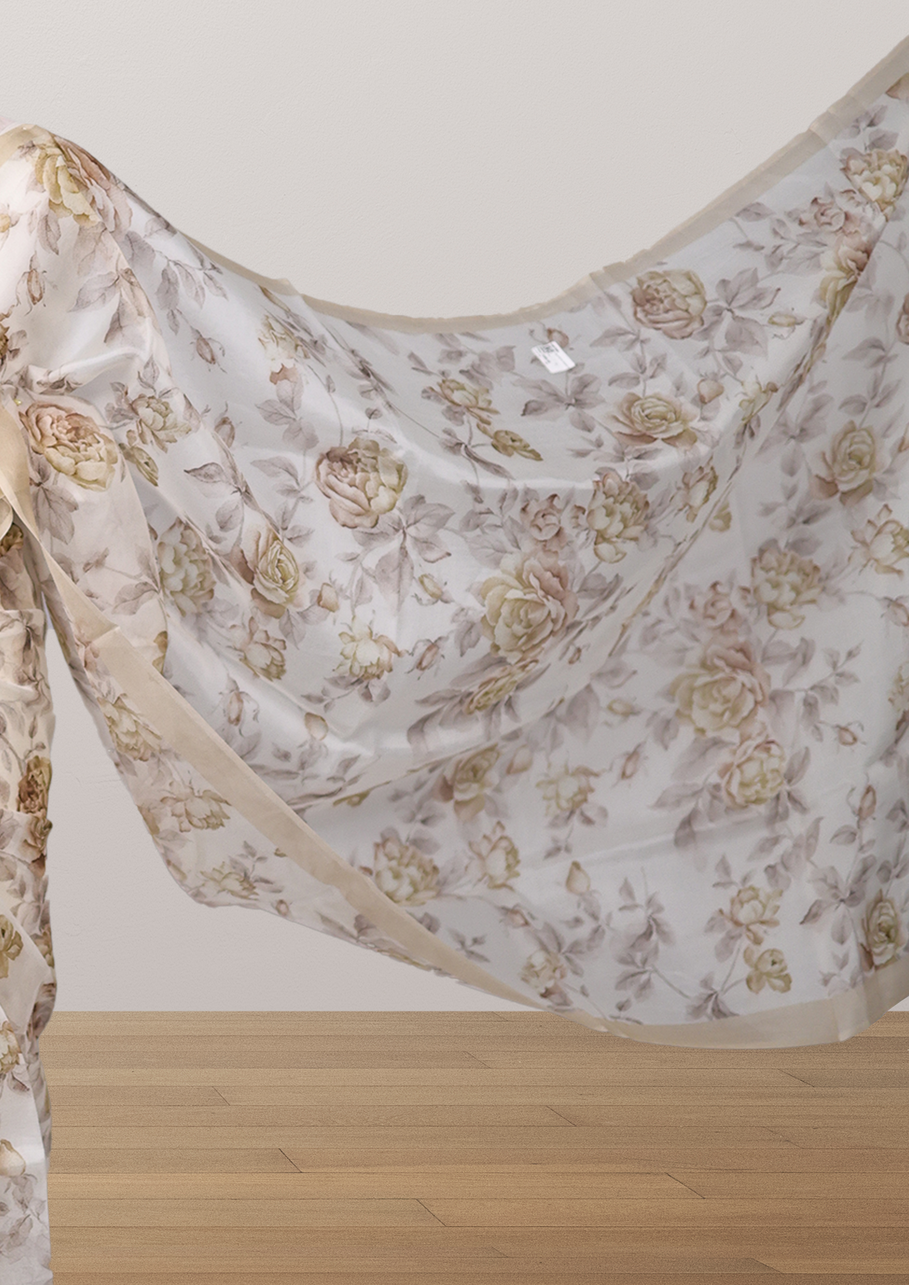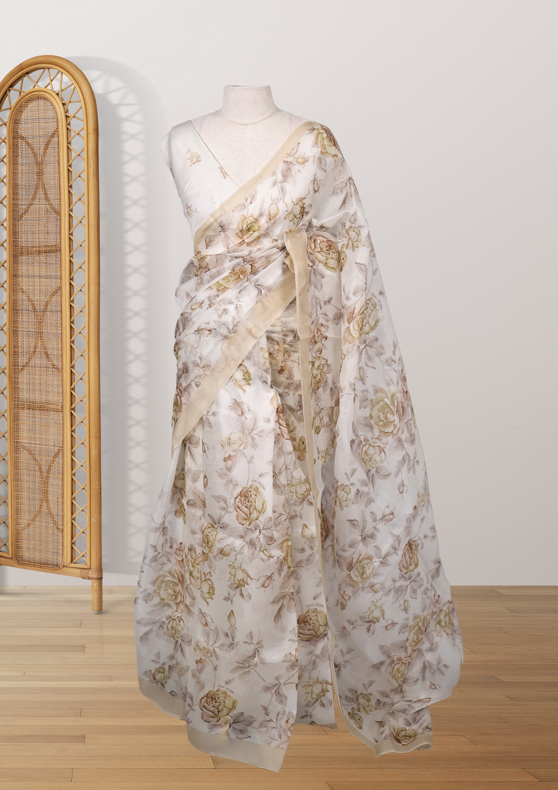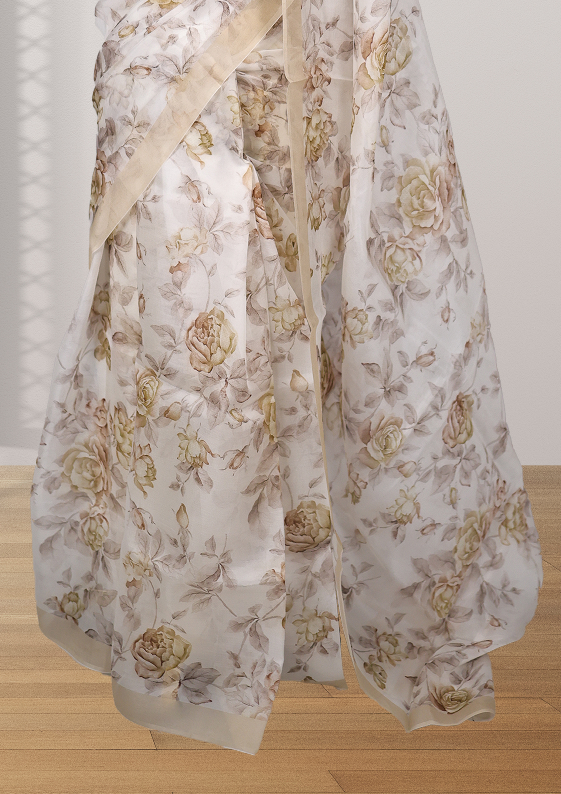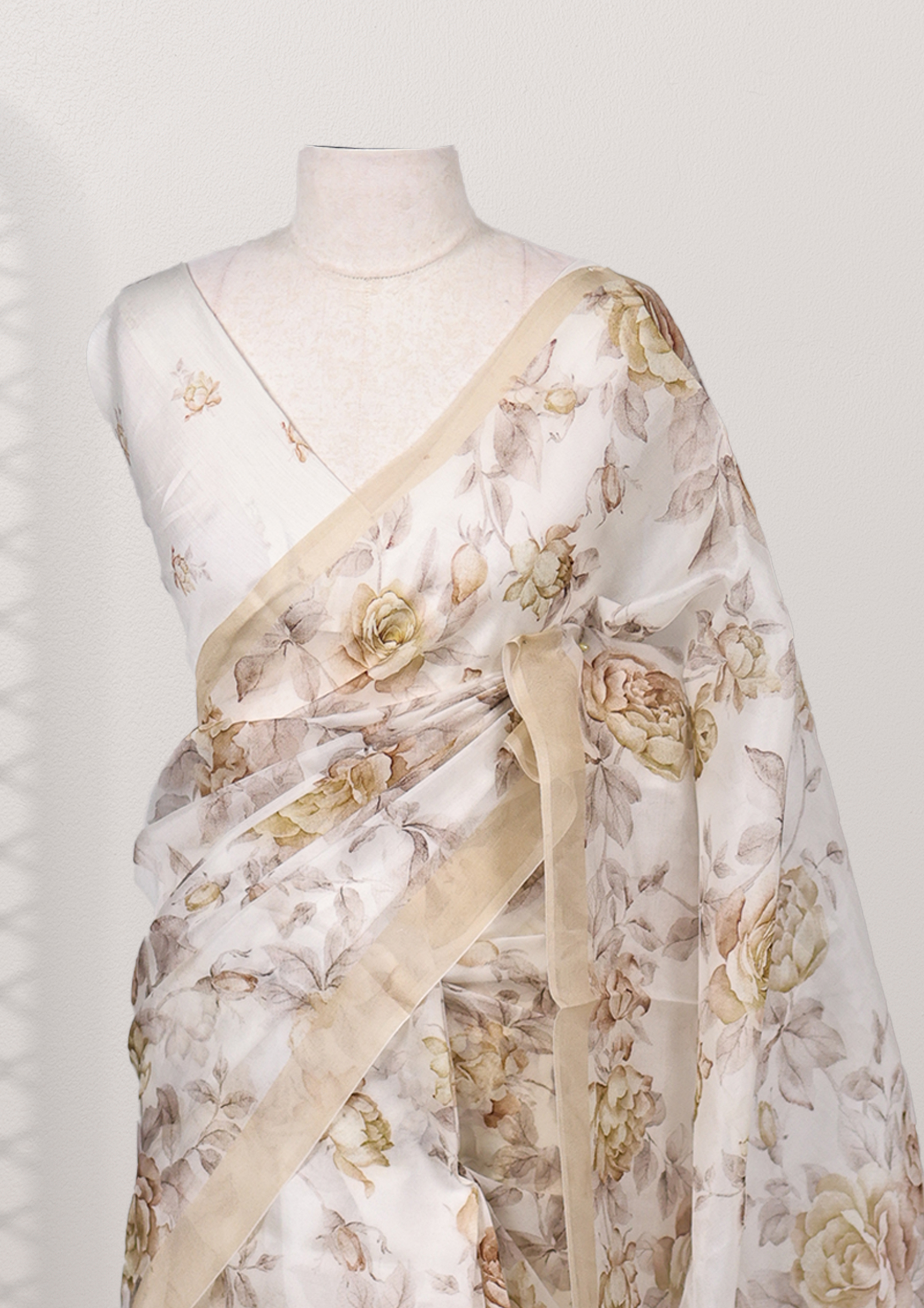 This stunning saree boasts a beautiful floral pattern in soothing shades of blue, brown, and cream on a crisp white base. The delicate design gives off a vintage charm, perfect for those who love classic yet contemporary ethnic wear. The saree features tassels with golden accents at the top, adding a touch of sophistication. Ideal for festive occasions, casual gatherings, or even a chic day out! The subtle color palette makes it versatile for various events. Grab this beauty online and elevate your ethnic wardrobe!