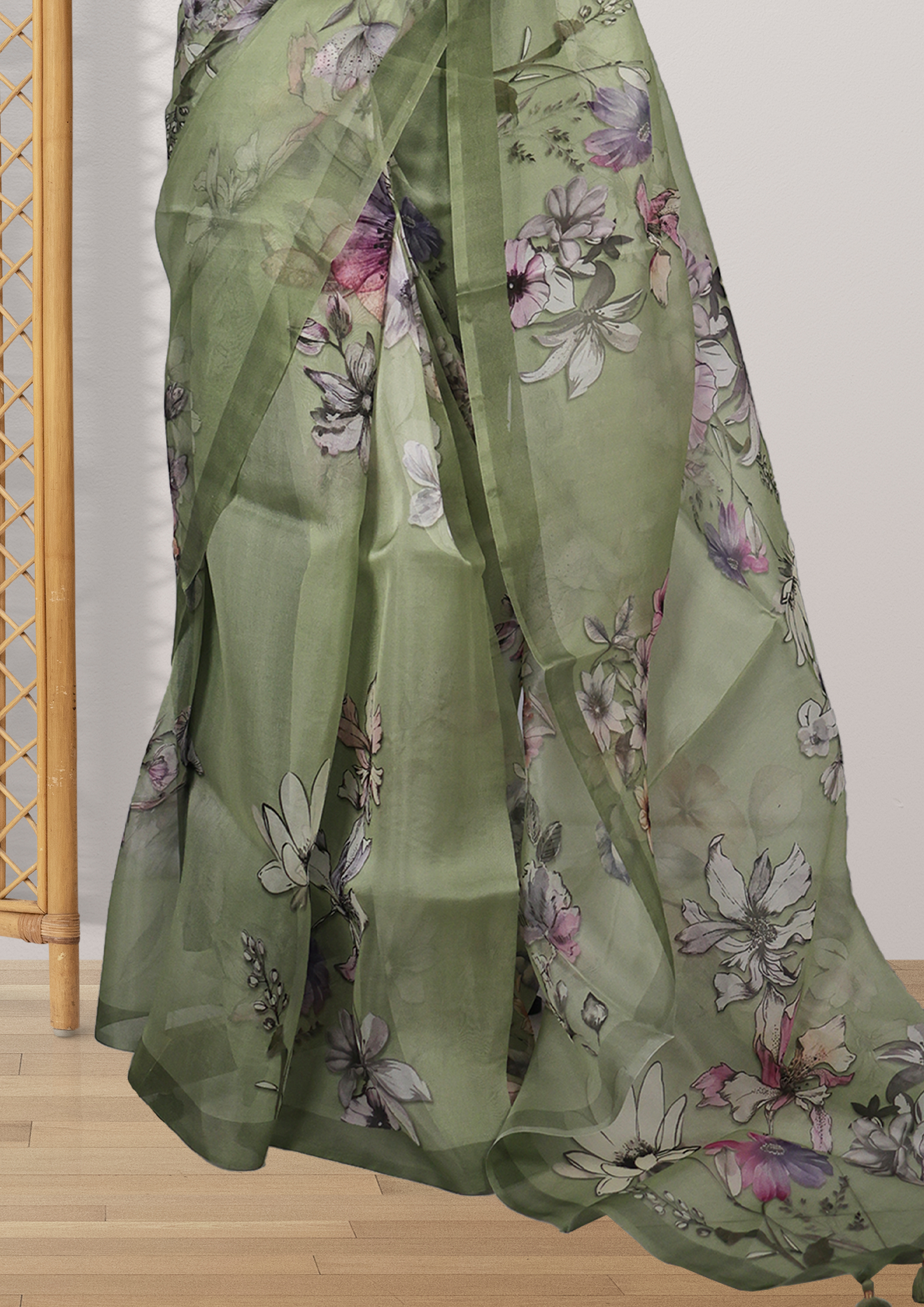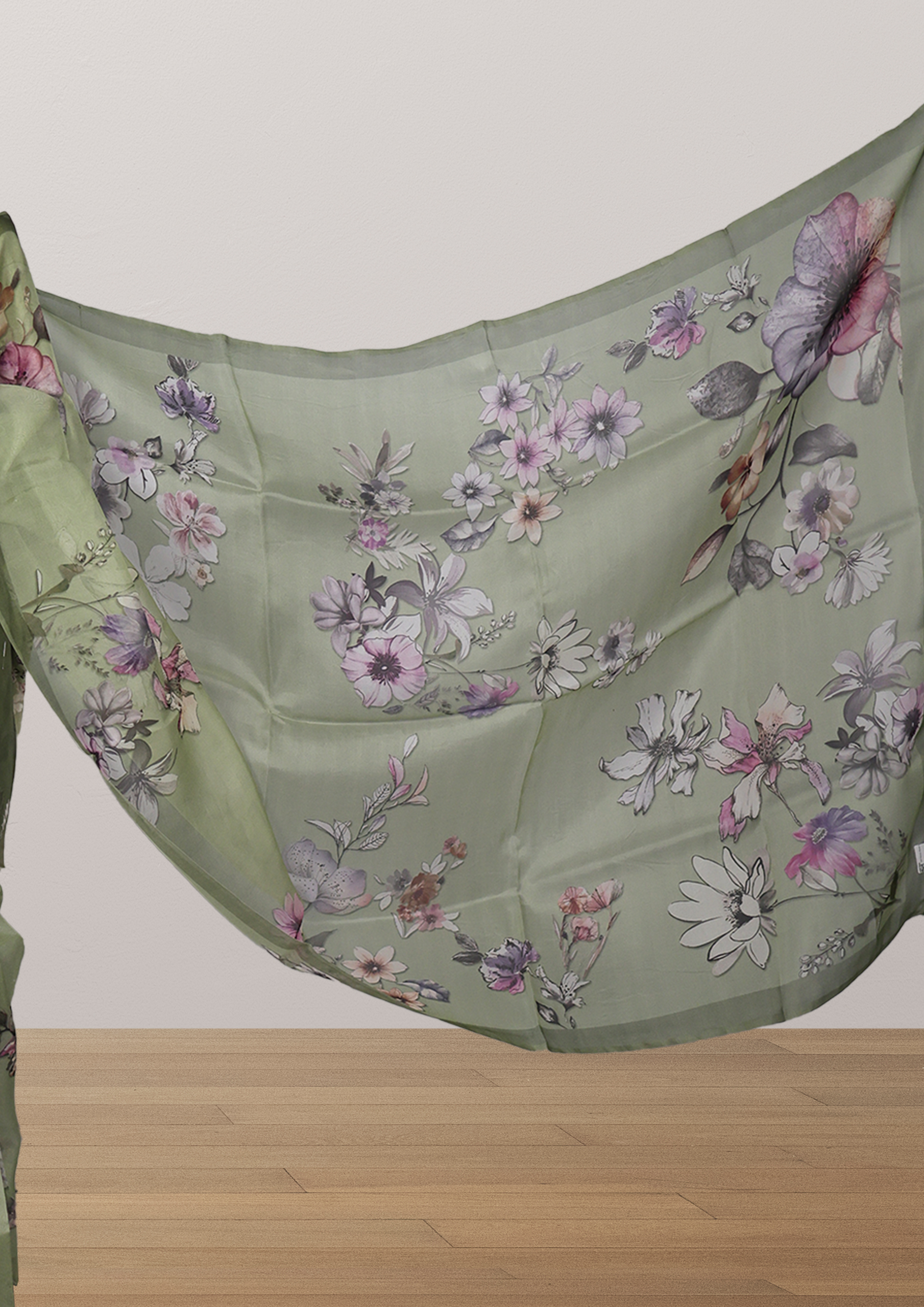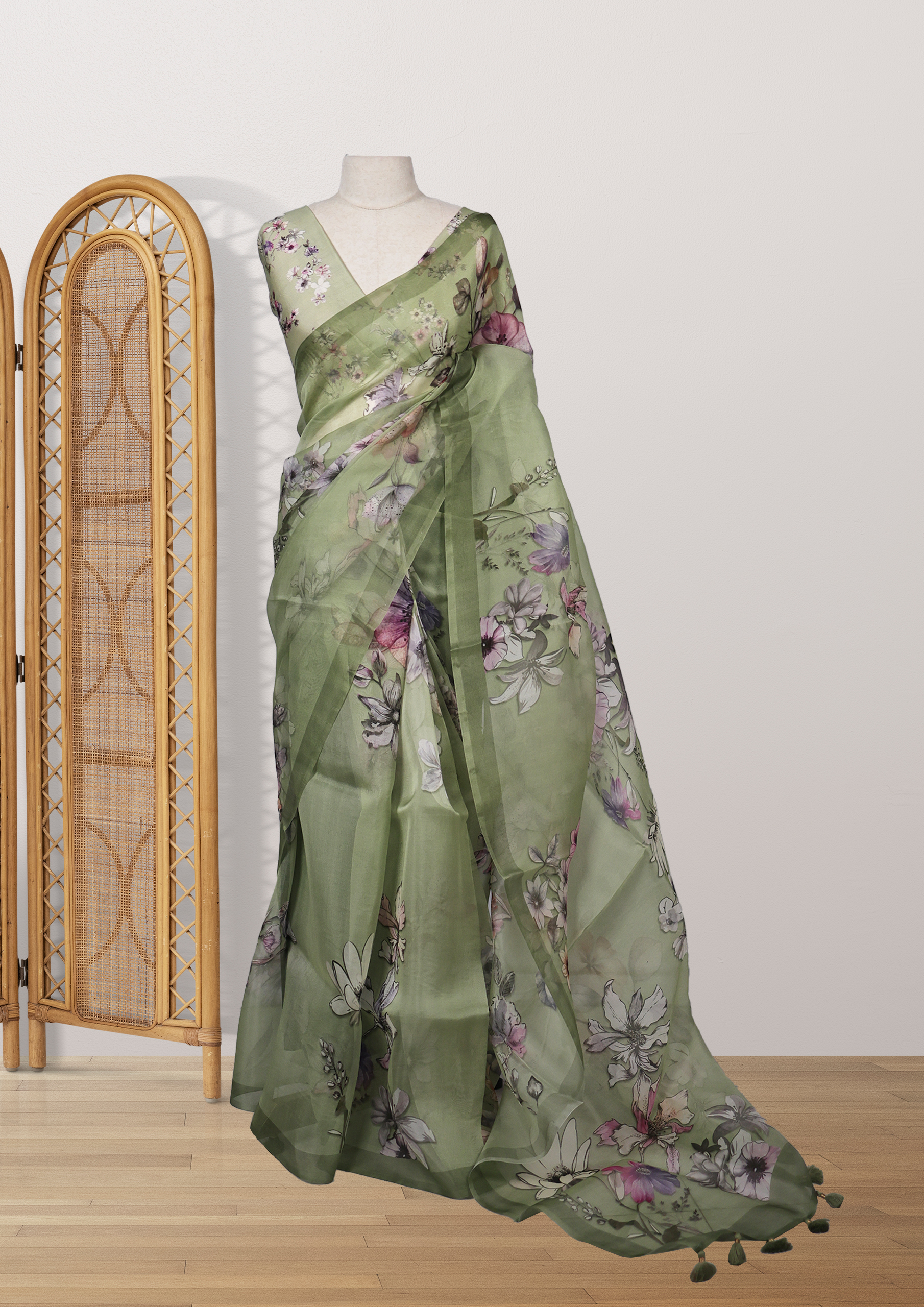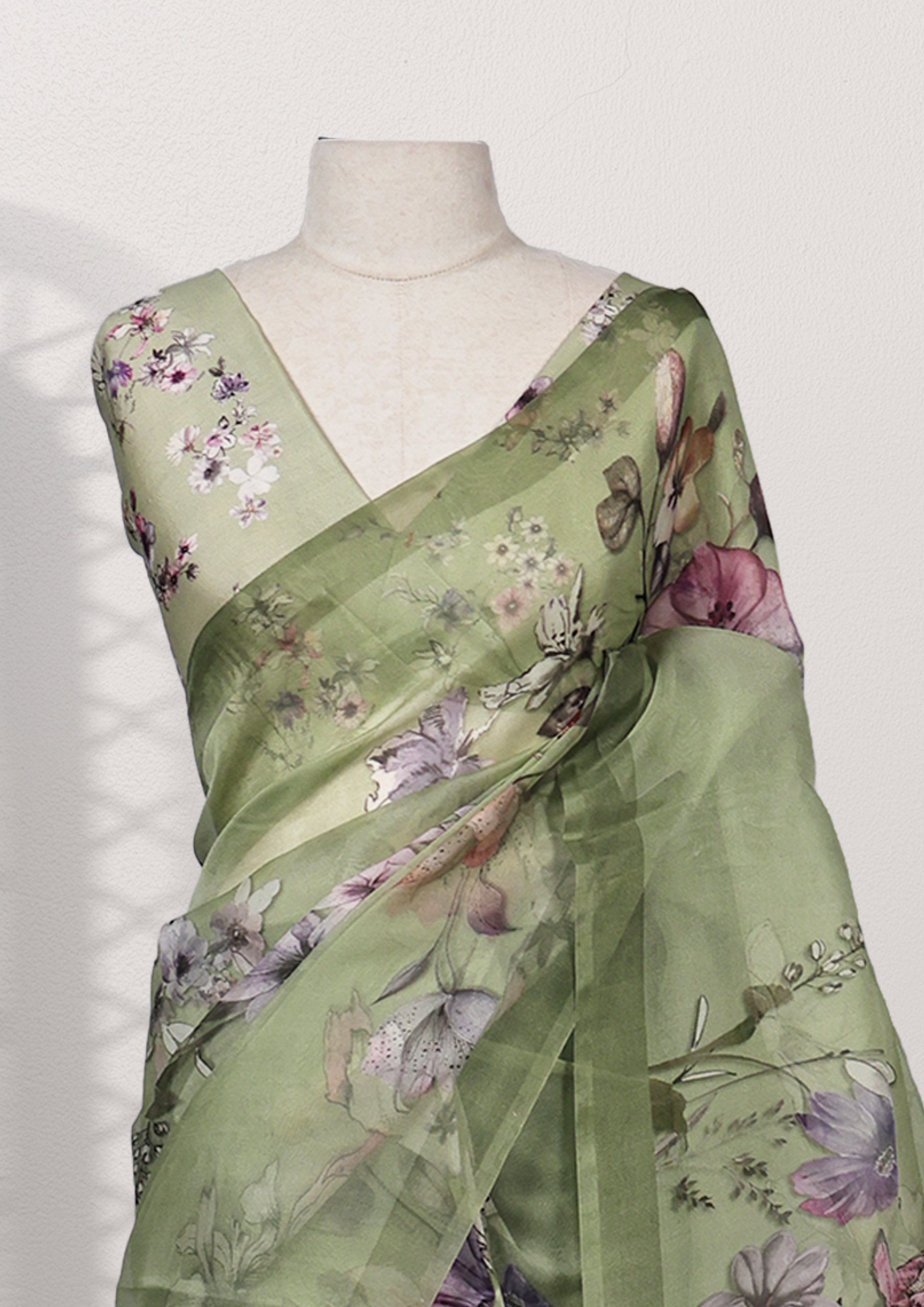 This green floral saree with a sheer overlay is draped elegantly on a display, showcasing its beautiful design on a crisp white table. The saree features a light green base adorned with a delicate floral pattern in shades of white, pink, and purple, complemented by subtle leaf details. The sheer fabric adds a touch of sophistication, making it perfect for a stylish occasion. If you’re looking to sell this saree, you could highlight its unique blend of traditional floral motifs with a modern sheer overlay, ideal for festive events or weddings in India.