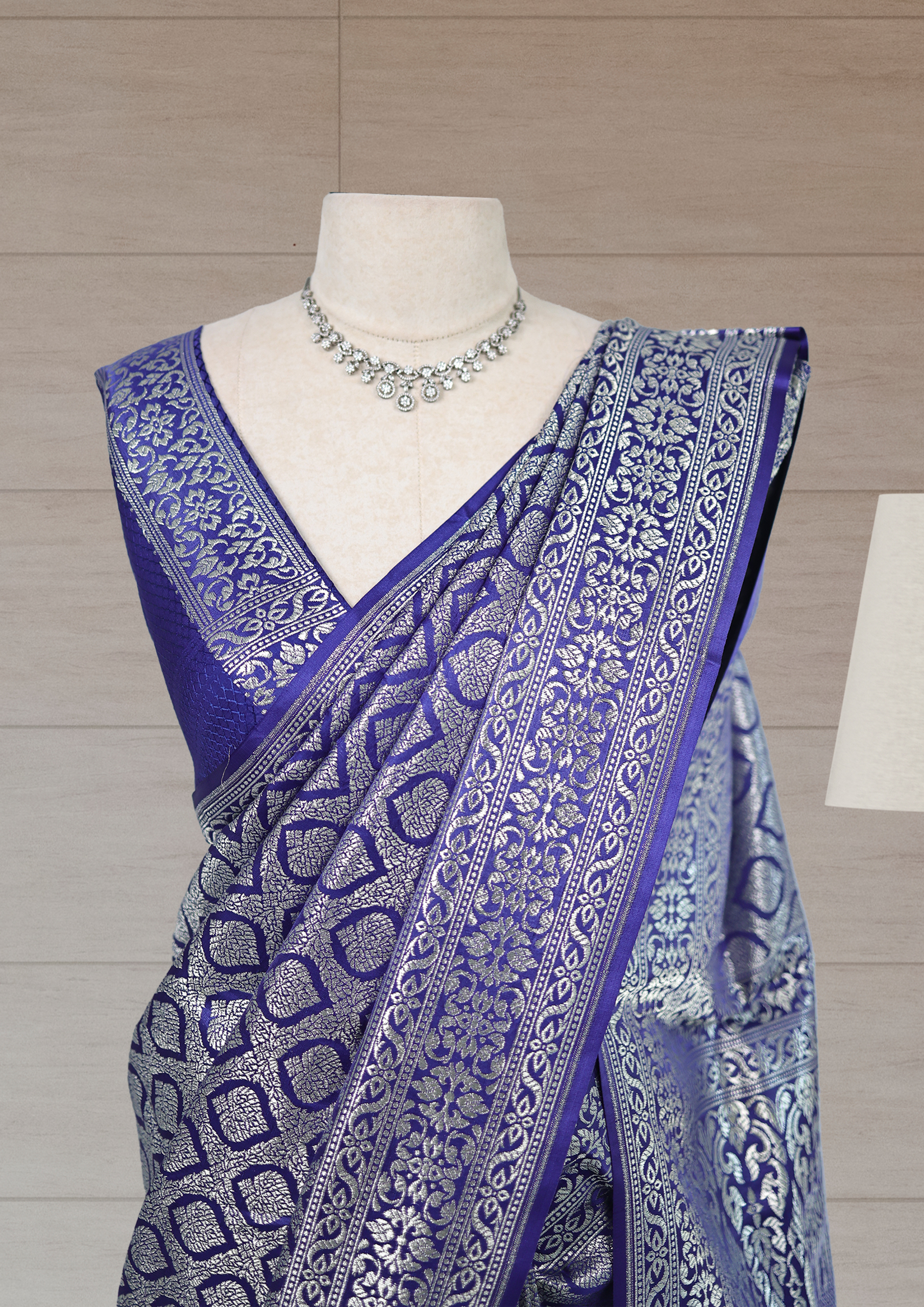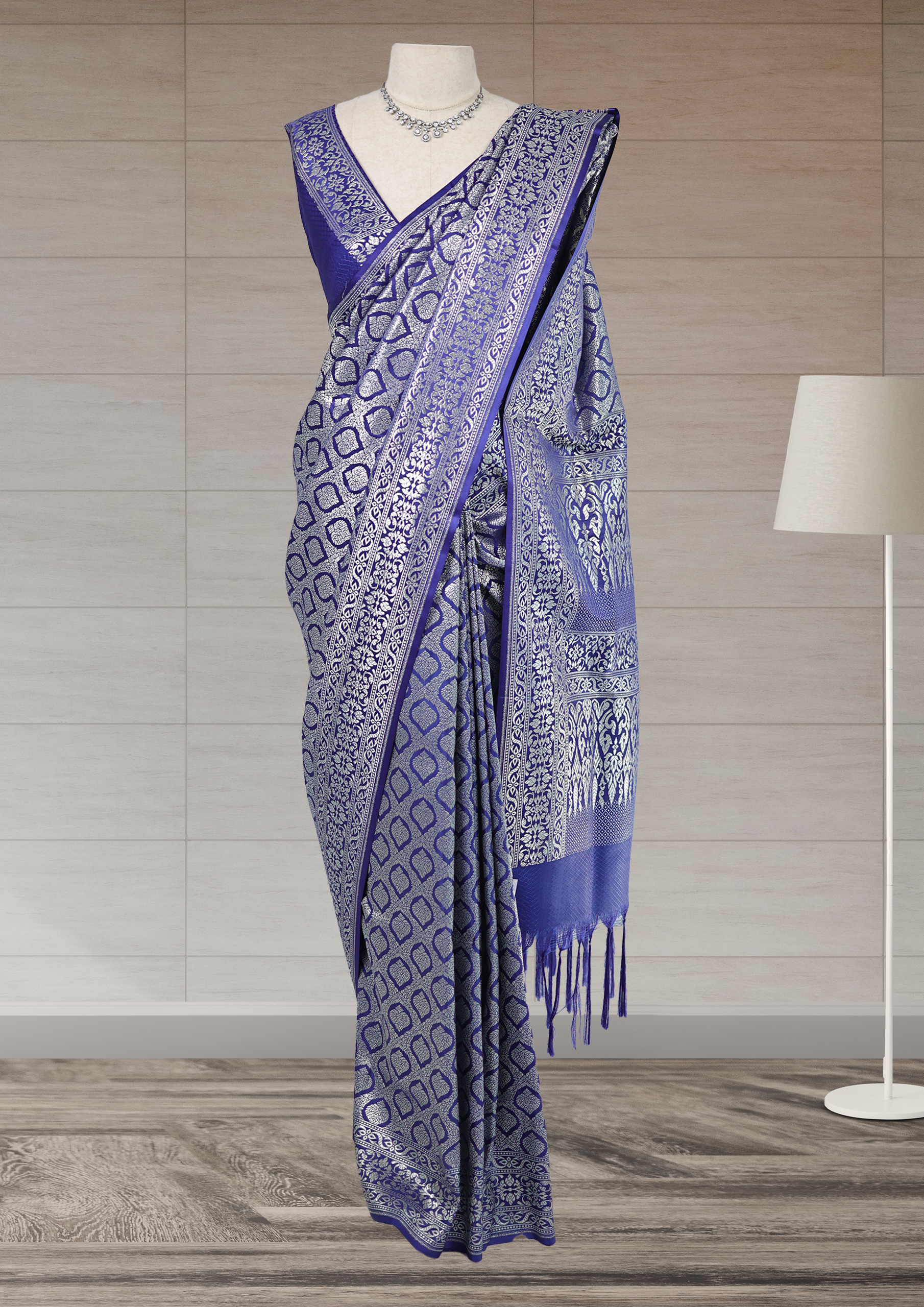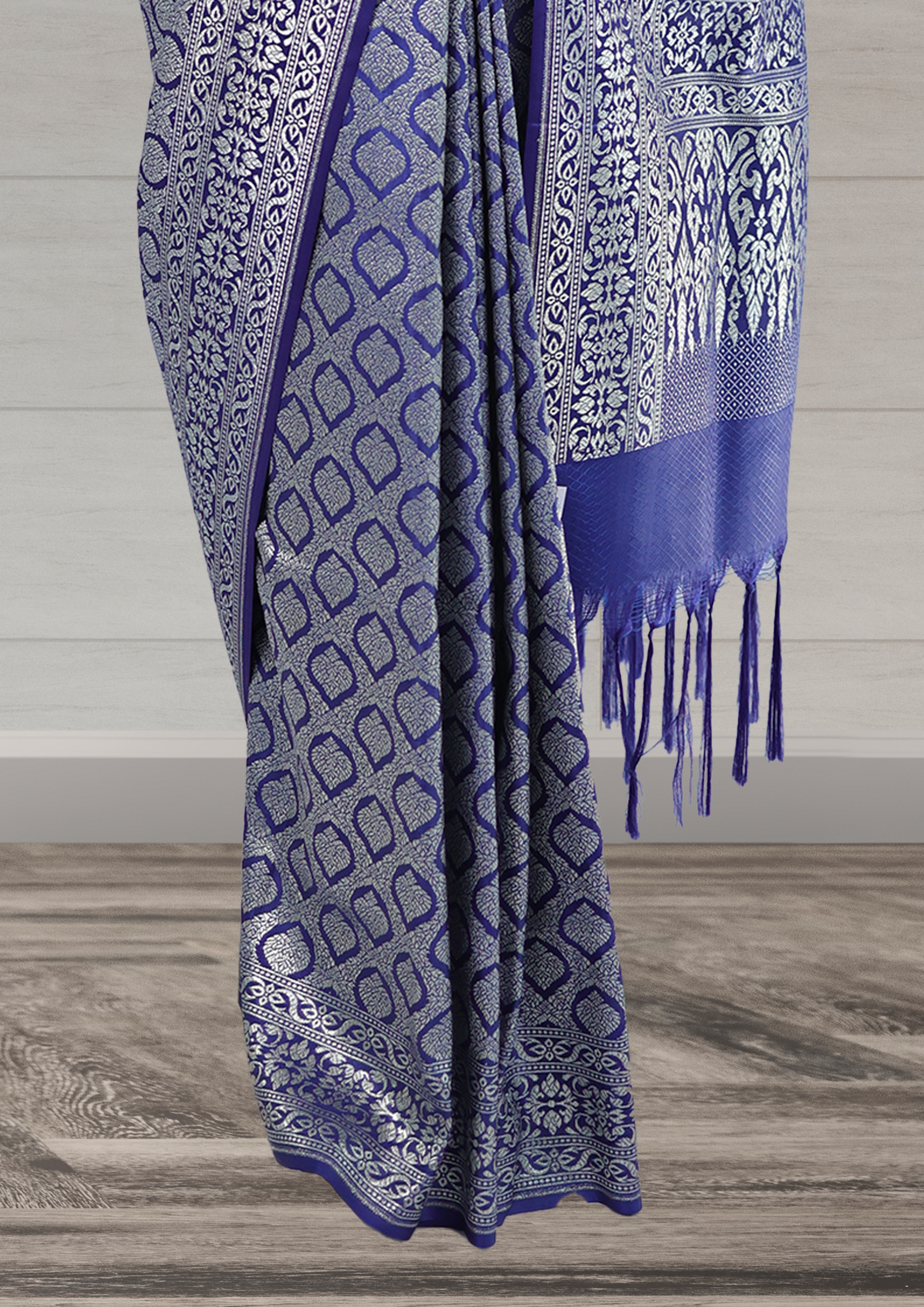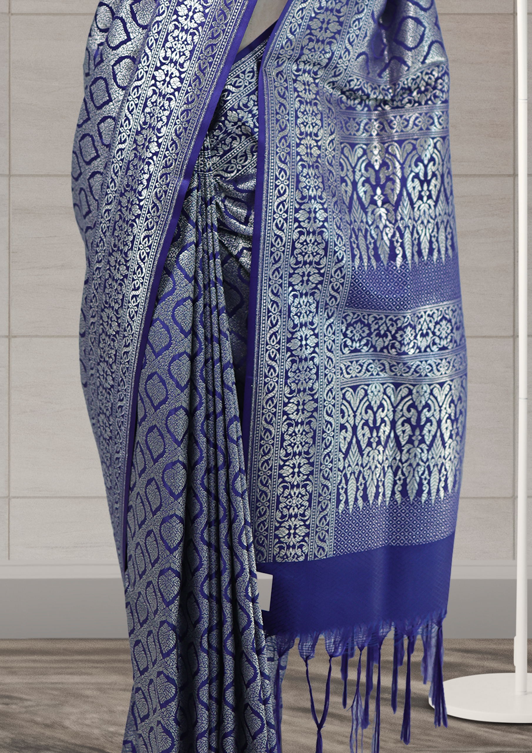 Ethnic wardrobe stunning saree! 😍 The saree boasts a gorgeous grey and blue color combo with an intricate diamond pattern woven in royal blue against a textured grey background. The design gives off a chic and traditional vibe, perfect for any festive occasion or a classy day out.