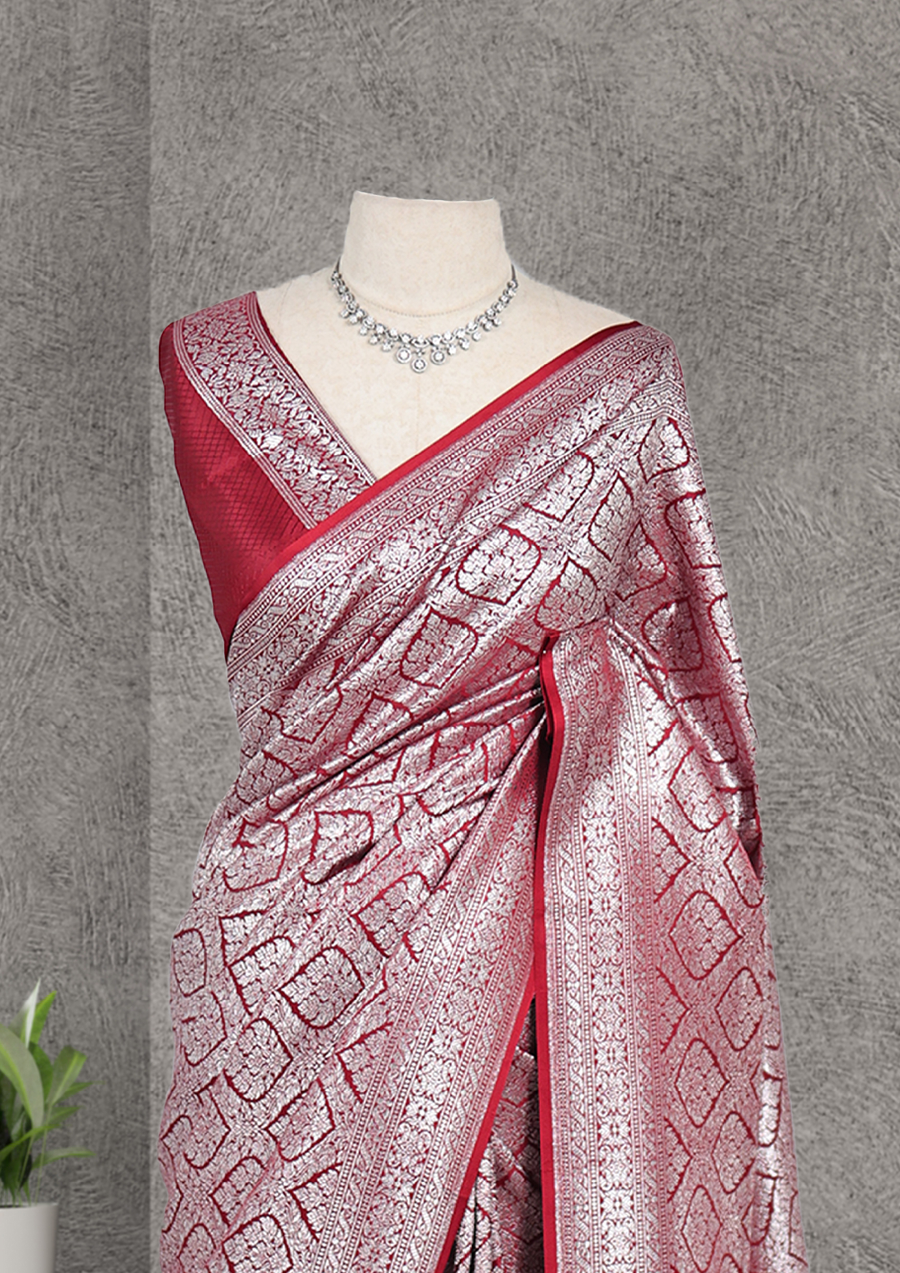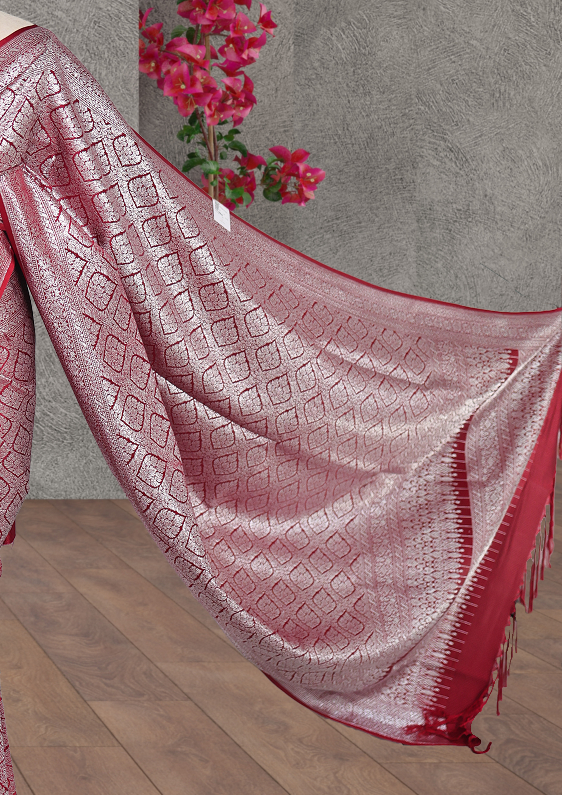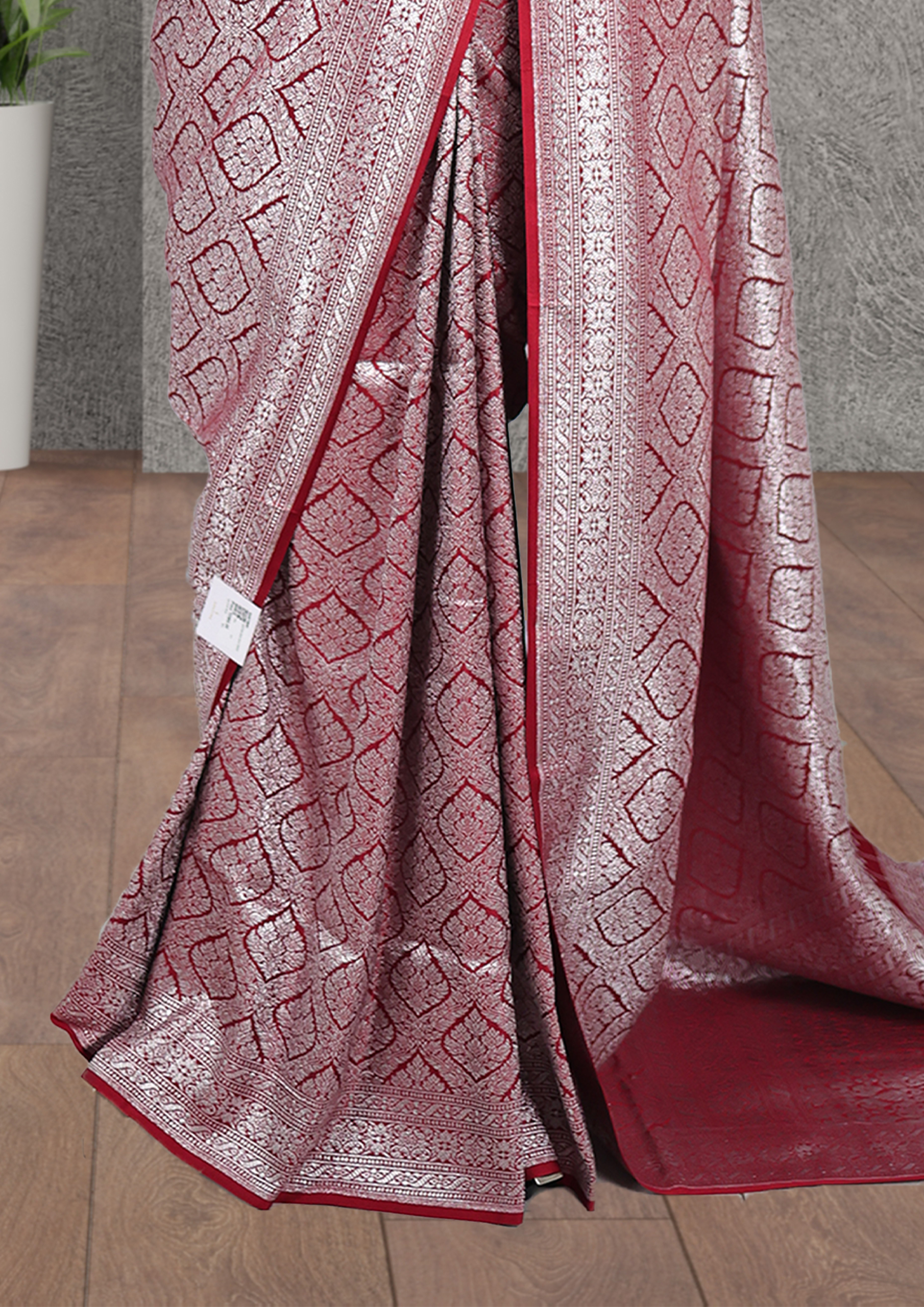 The overall design suggests a traditional Banarasi saree, known for its heavy zari work and intricate patterns, often used for special occasions like weddings in India.