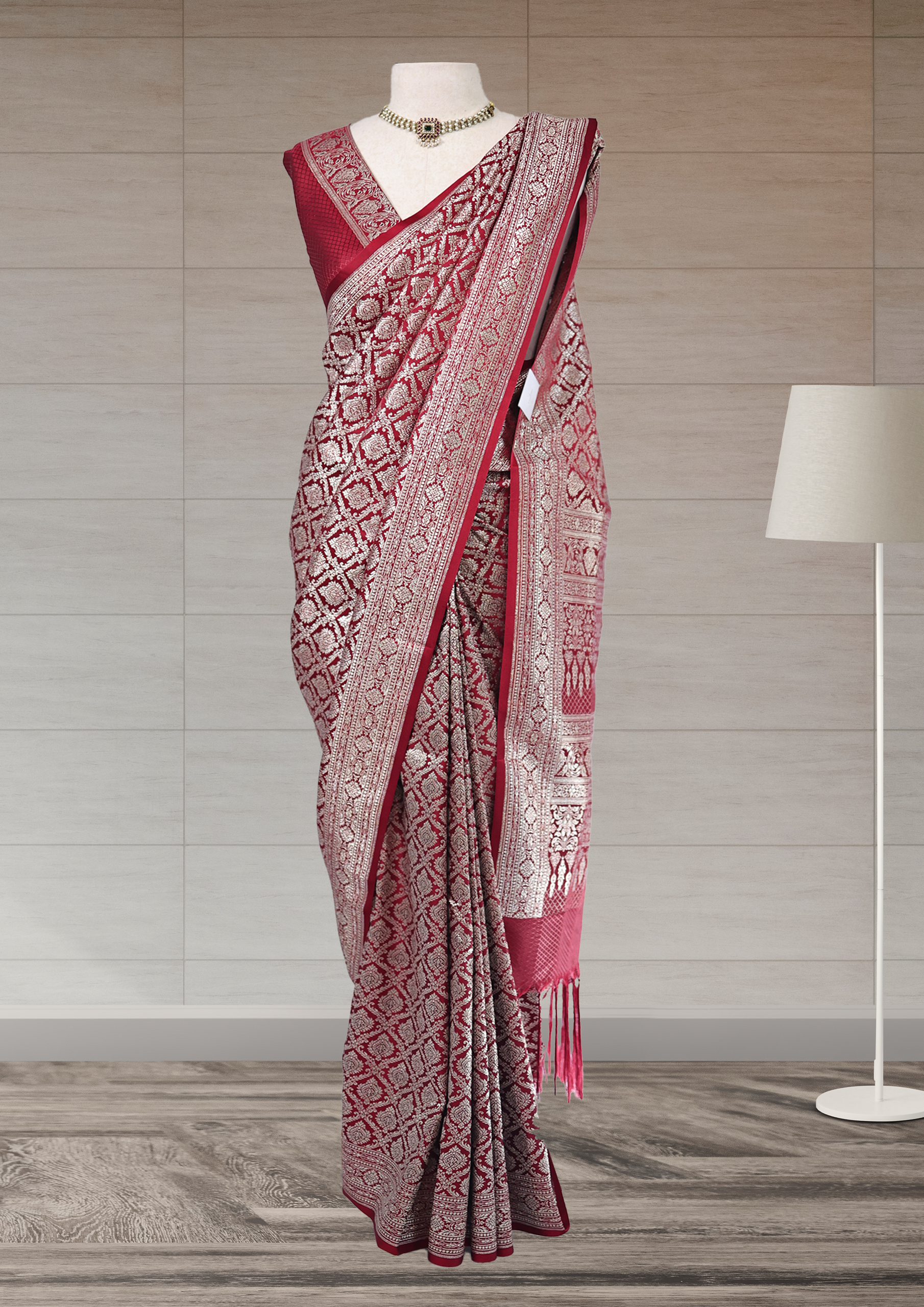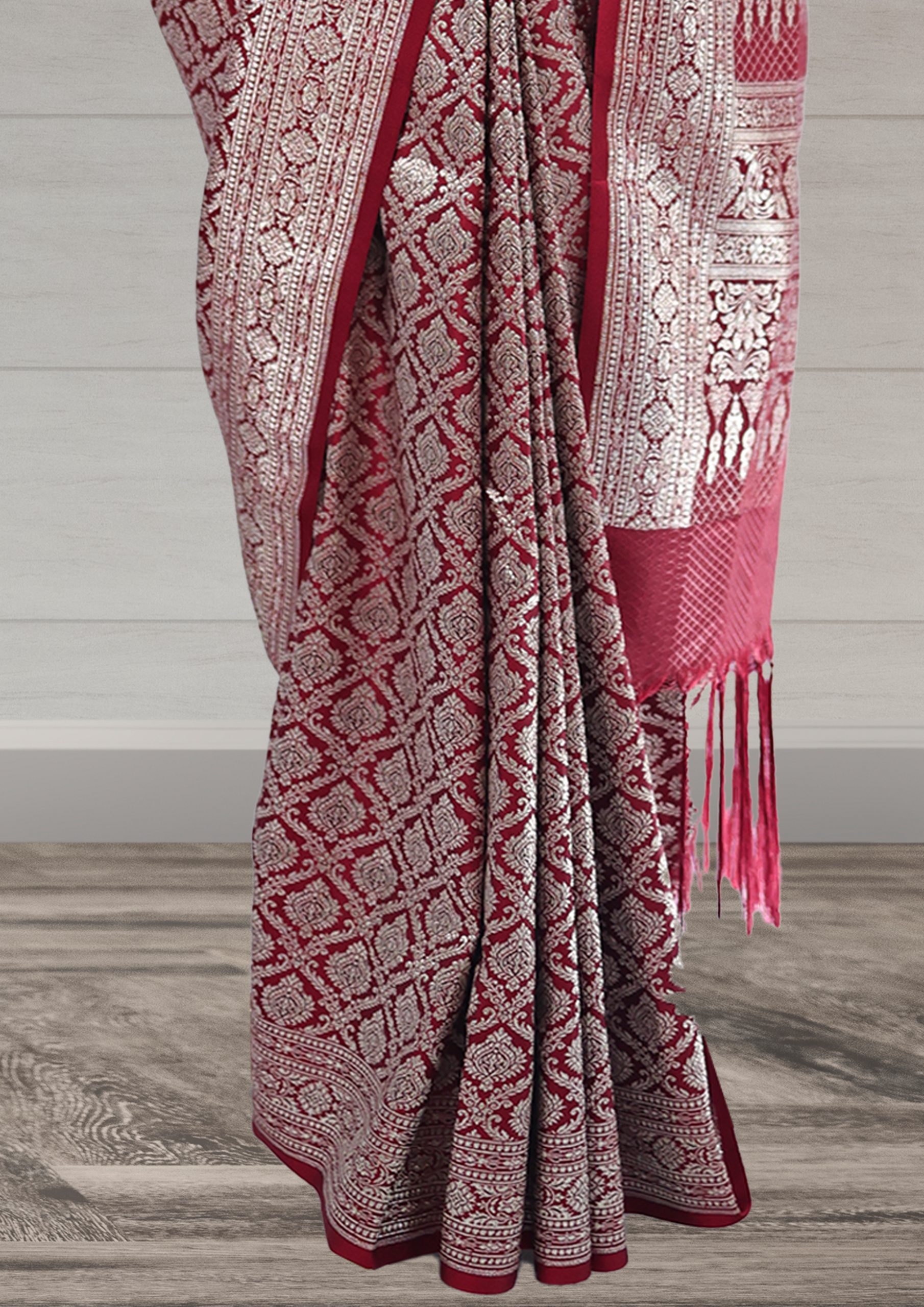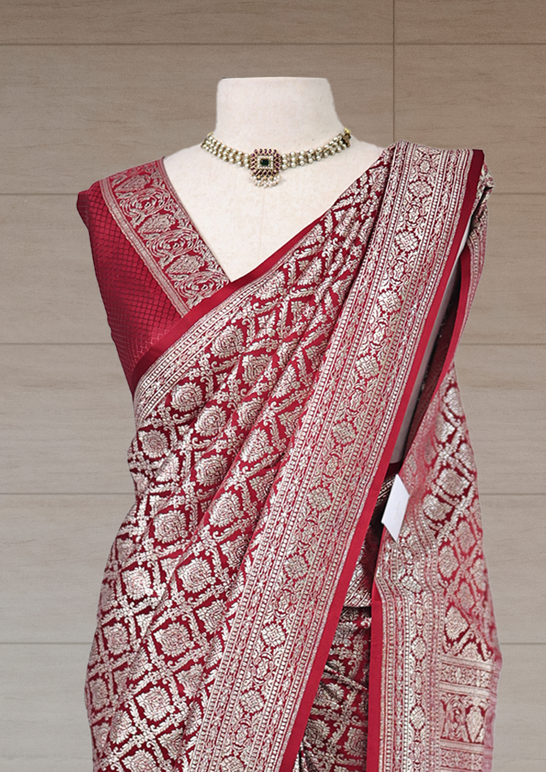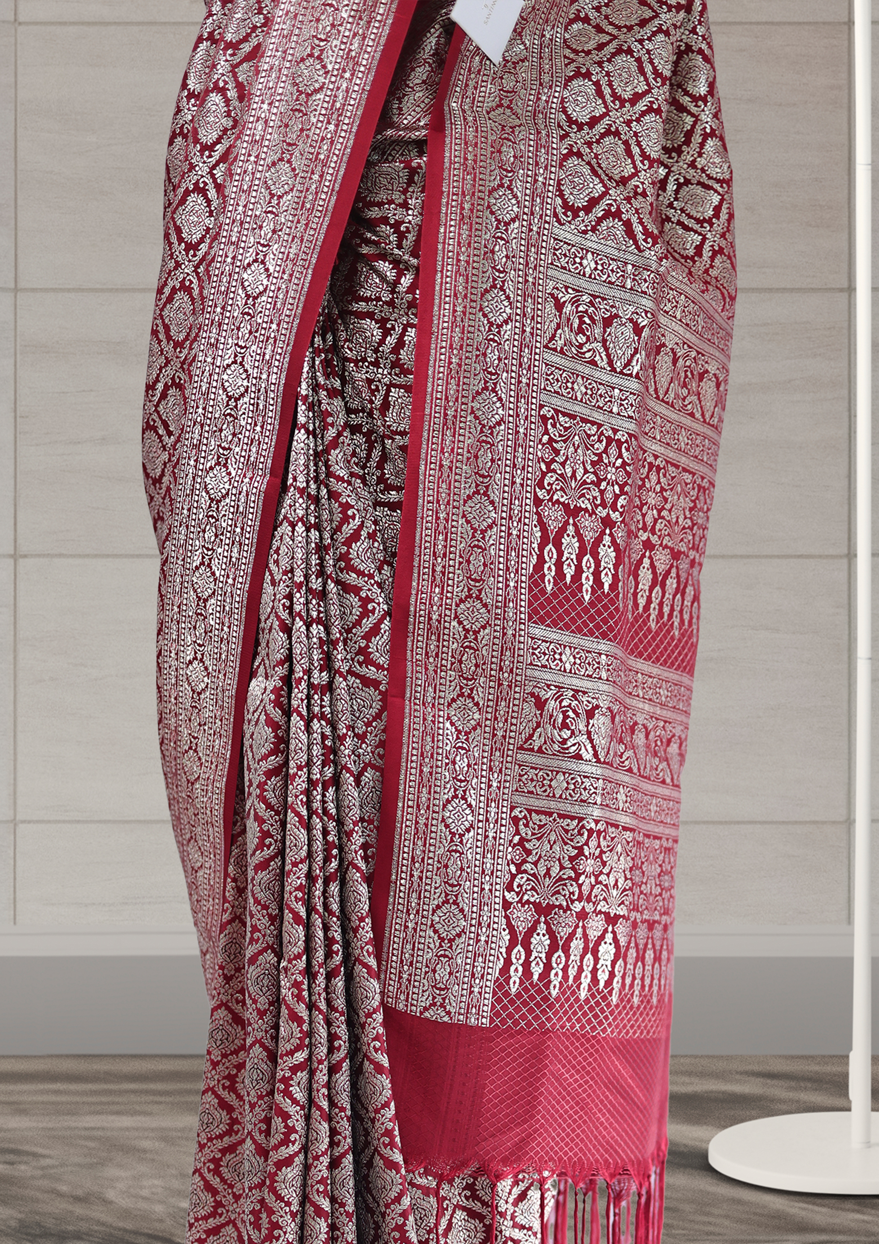 This stunning red saree boasts intricate silver zari work that weaves a mesmerizing pattern of interconnected diamond shapes filled with detailed floral motifs. The rich red base contrasts beautifully with the shimmering silver threads, giving the saree a regal and traditional touch. The fabric resembles a luxurious Banarasi silk, renowned for its opulent zari work and rich texture. The saree is neatly folded and placed on a sleek white surface, highlighting its elegance. Perfect for special occasions like weddings or festivals, this saree would sell well online due to its classic design and striking appearance.
