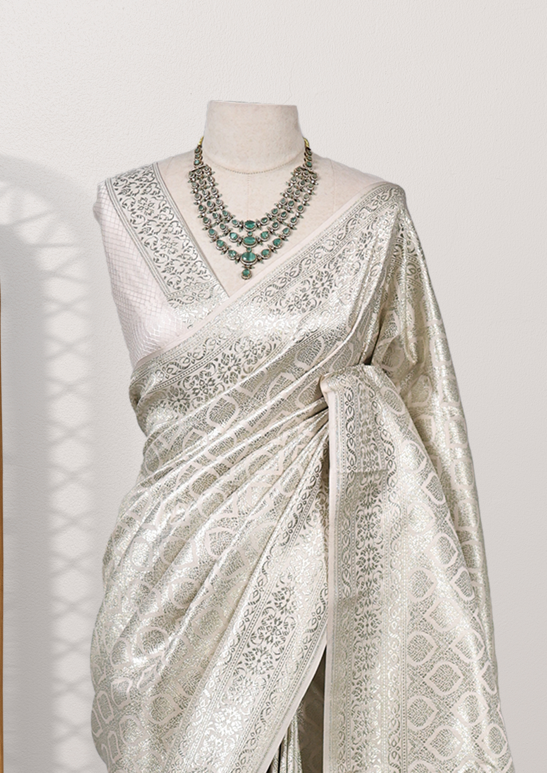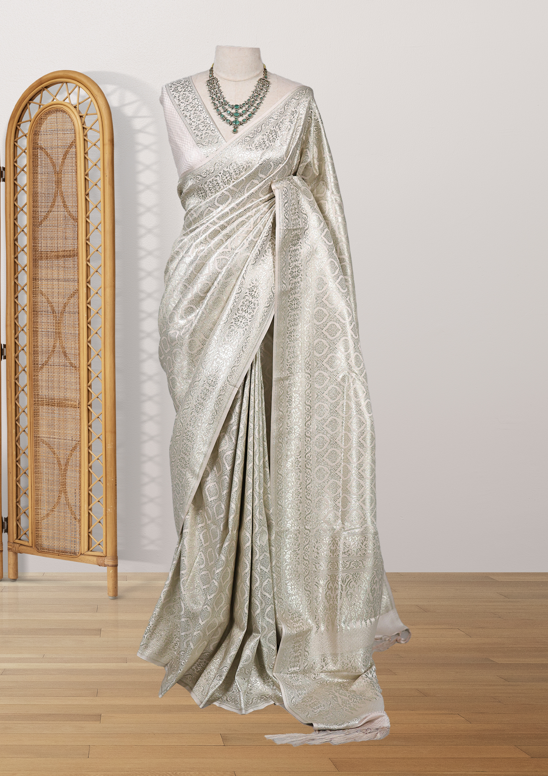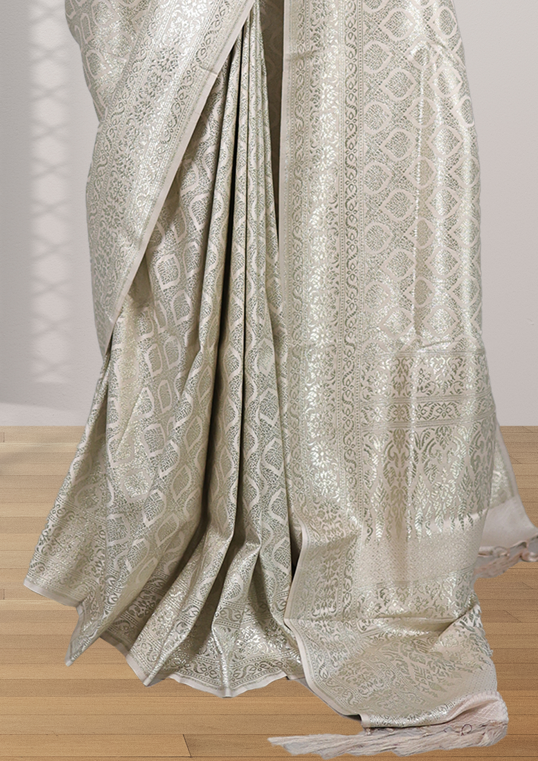 This saree is a stunning piece of off-white or beige fabric with an intricate lace-like pattern embossed or woven into it. The fabric appears to have a textured, almost three-dimensional quality due to the raised pattern, giving it a sophisticated and elegant look. The lace-like design features interlocking diamond shapes with floral motifs within them, adding a touch of traditional craftsmanship. Overall, the saree exudes a sense of grace and refinement, perfect for special occasions.