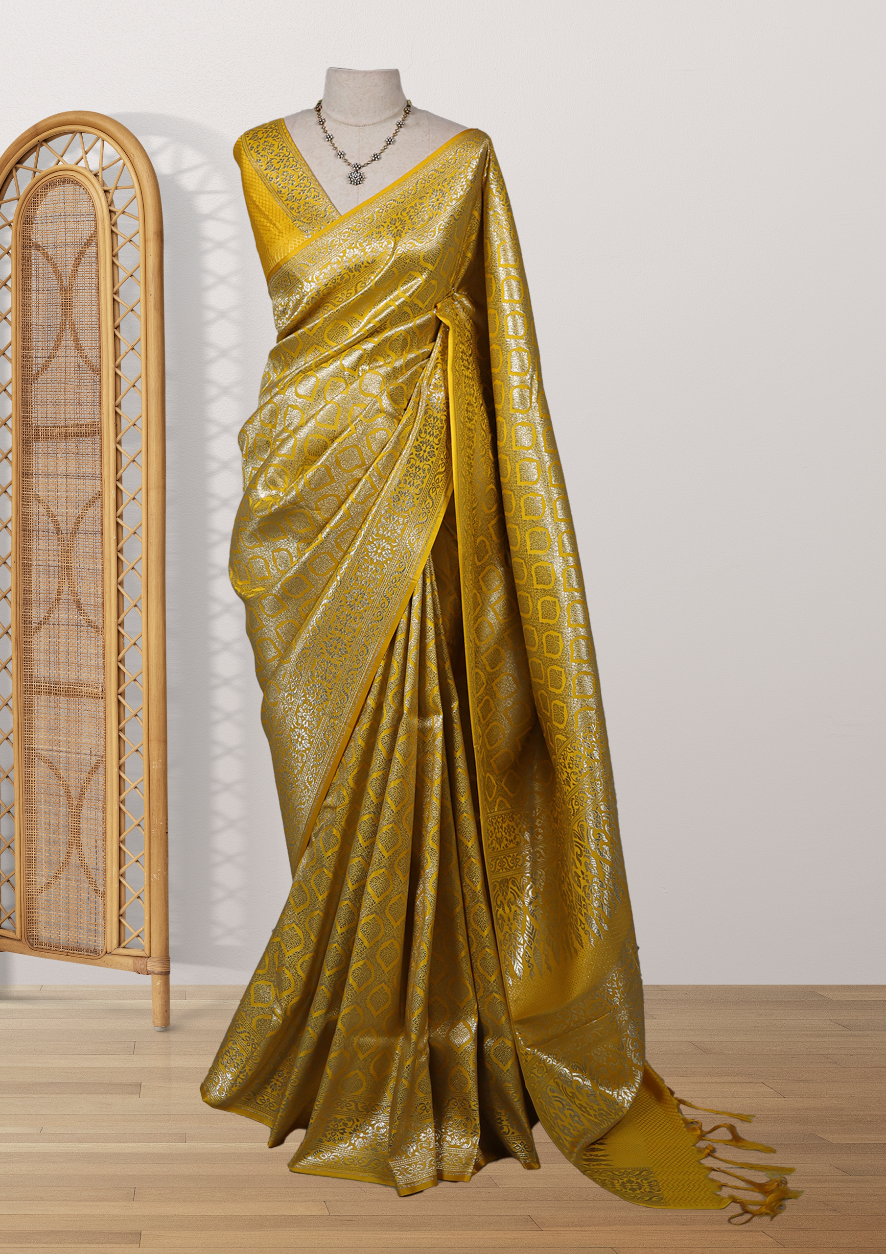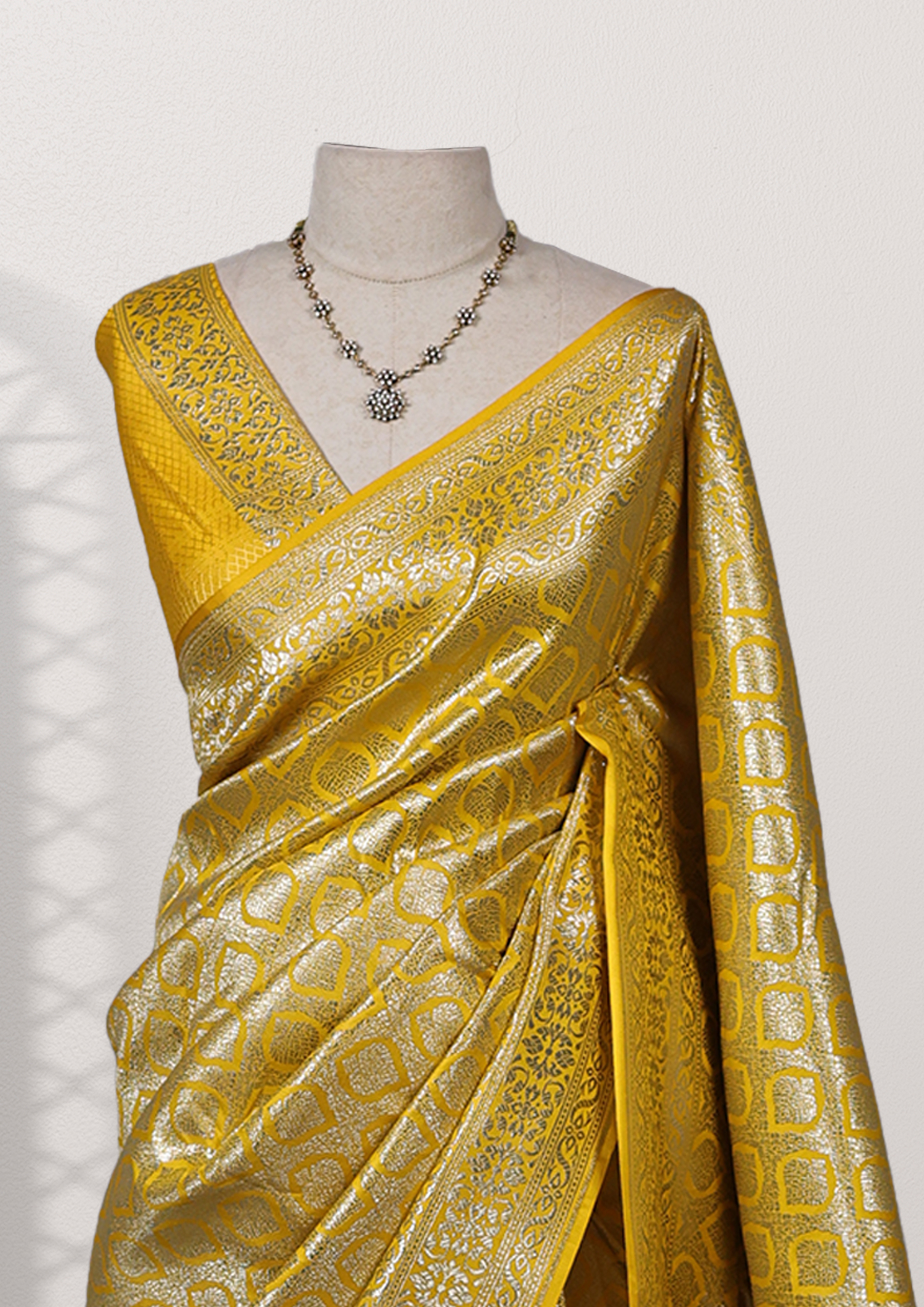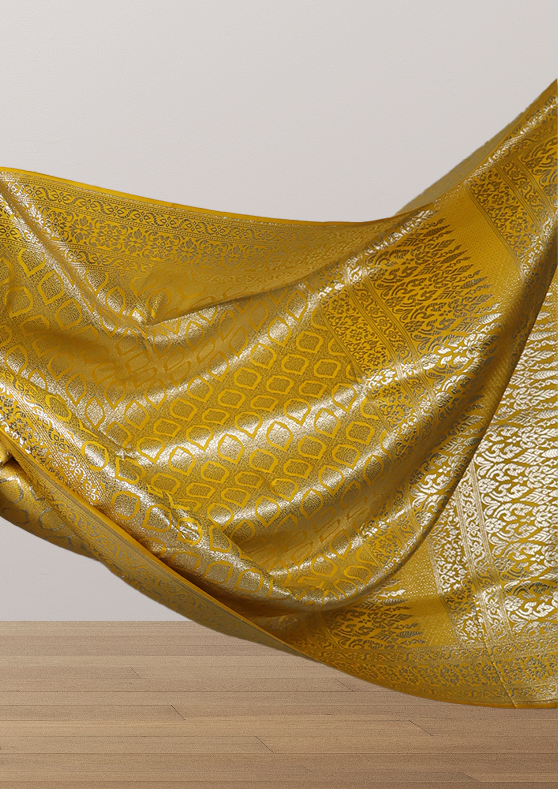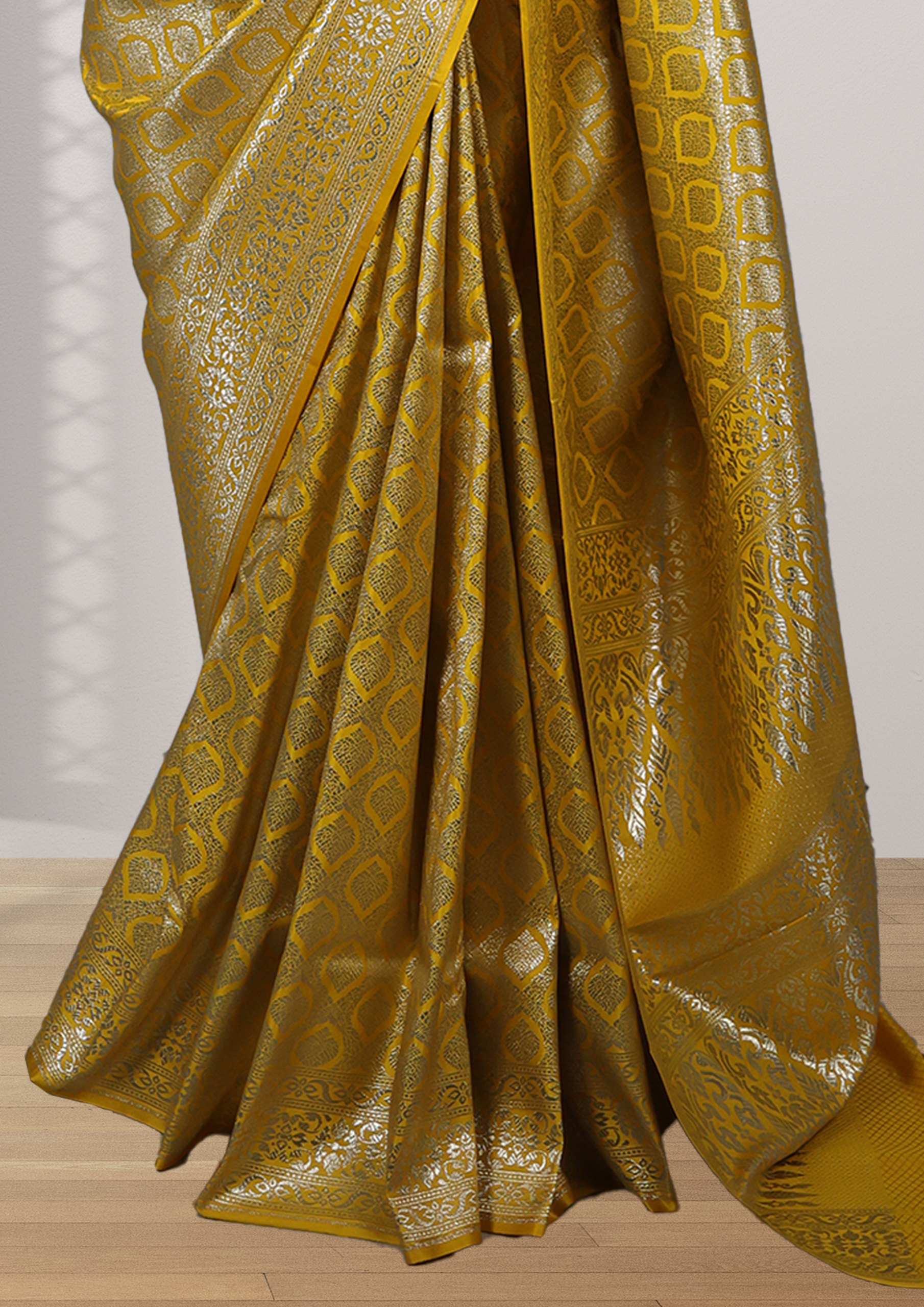 The saree boasts a vibrant golden-yellow hue with an intricate pattern of interlocking diamond shapes woven in shimmering silver zari. The design is dense and detailed, giving the fabric a rich and luxurious look. The edges of the saree peek out slightly from the folds, revealing more of the golden-yellow color with hints of orange tones. The overall effect is one of opulence and elegance, typical of high-quality Indian sarees often worn for special occasions like weddings or festivals.