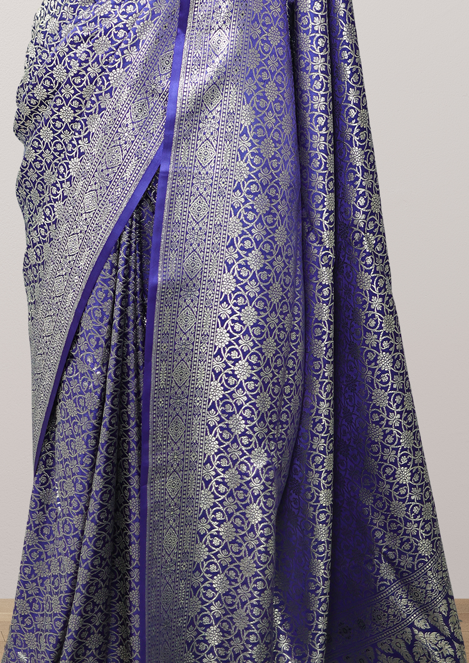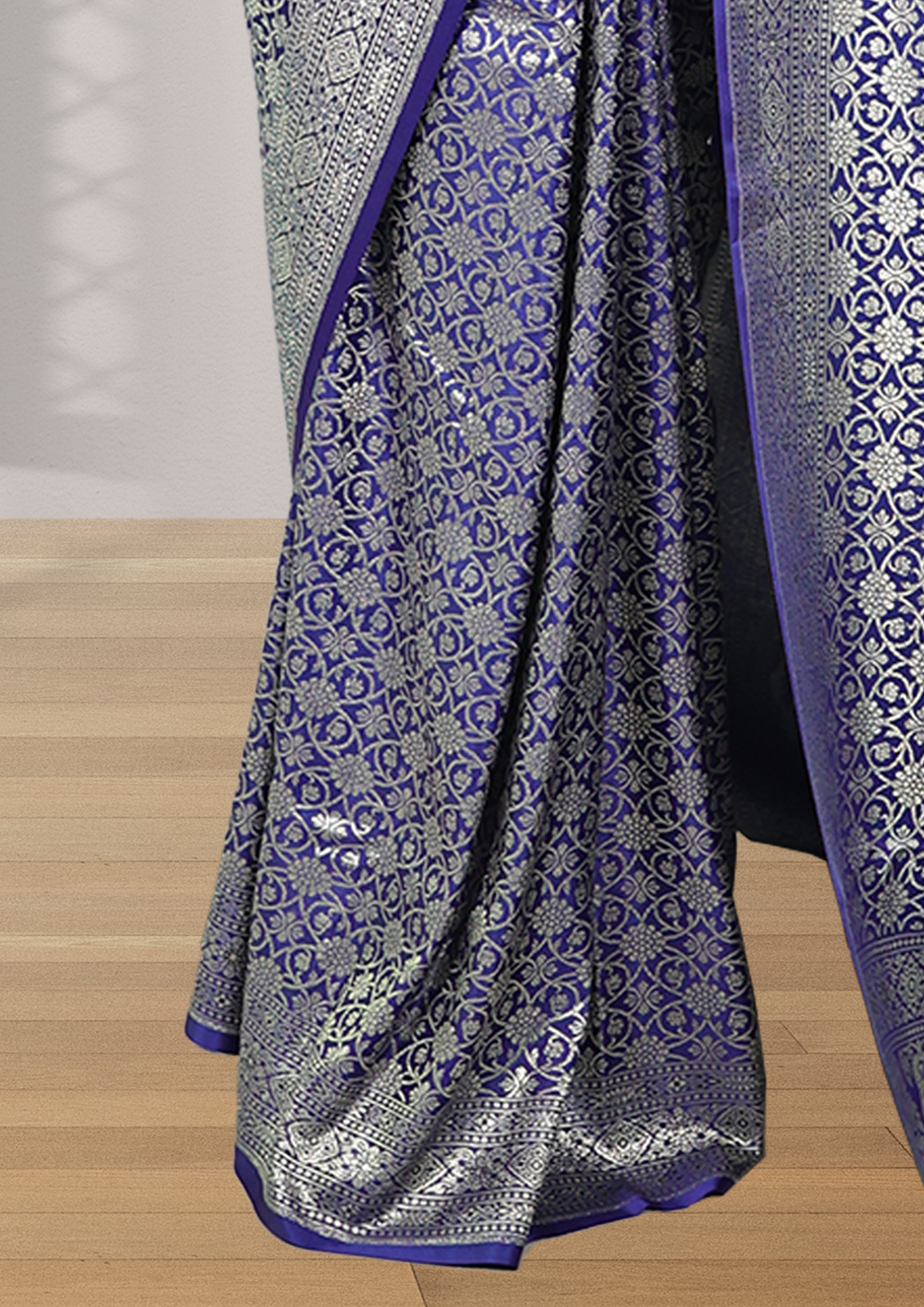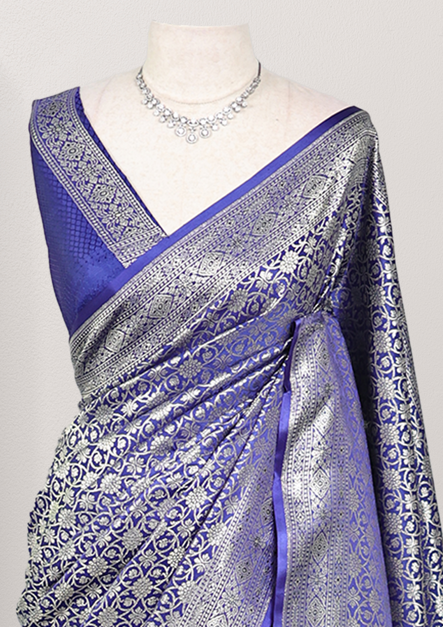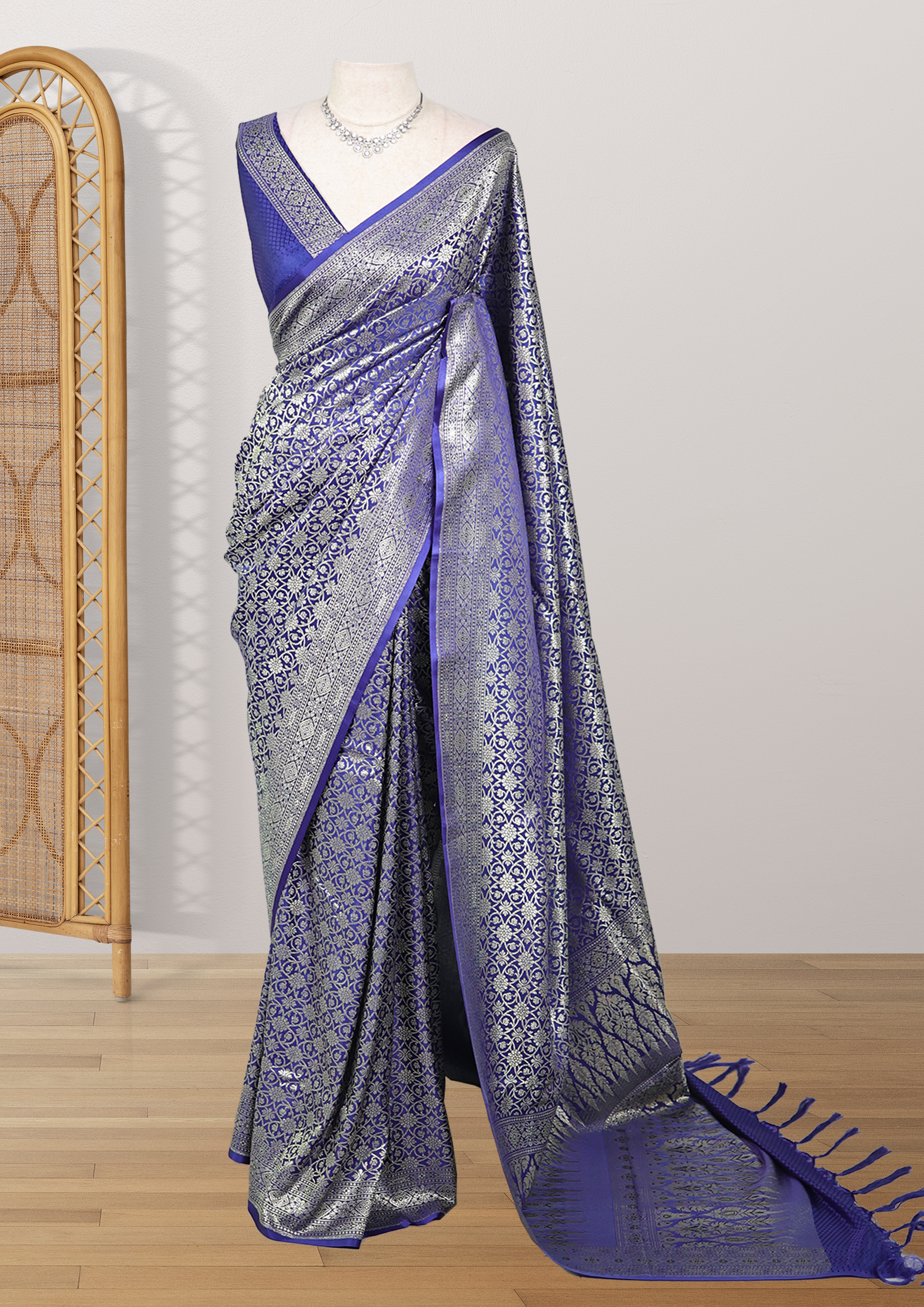 This stunning blue saree with intricate gold patterns is a true showstopper! The rich blue fabric is adorned with beautiful gold floral motifs and geometric designs, giving it a regal and traditional look. The saree seems to be made of a luxurious fabric, possibly silk, with a glossy finish that catches the light. A tiny blue tassel adds a delicate touch to the overall design. Placed on a sleek white surface, the saree’s vibrant blue and gold contrast beautifully, making it perfect for a special occasion like a wedding or a festive celebration in India. If you’re looking to buy a saree like this for a grand event, this one’s definitely a catch!