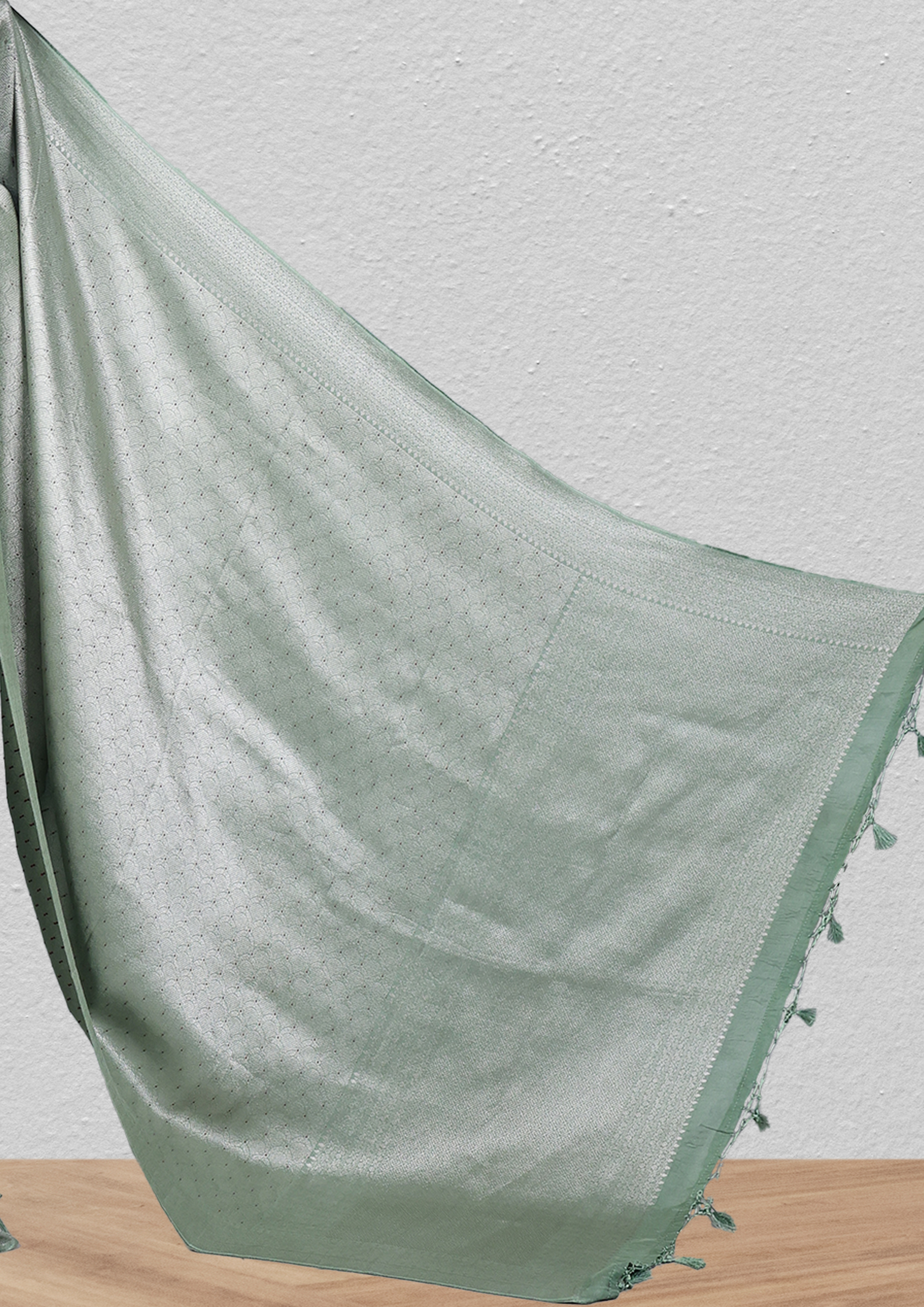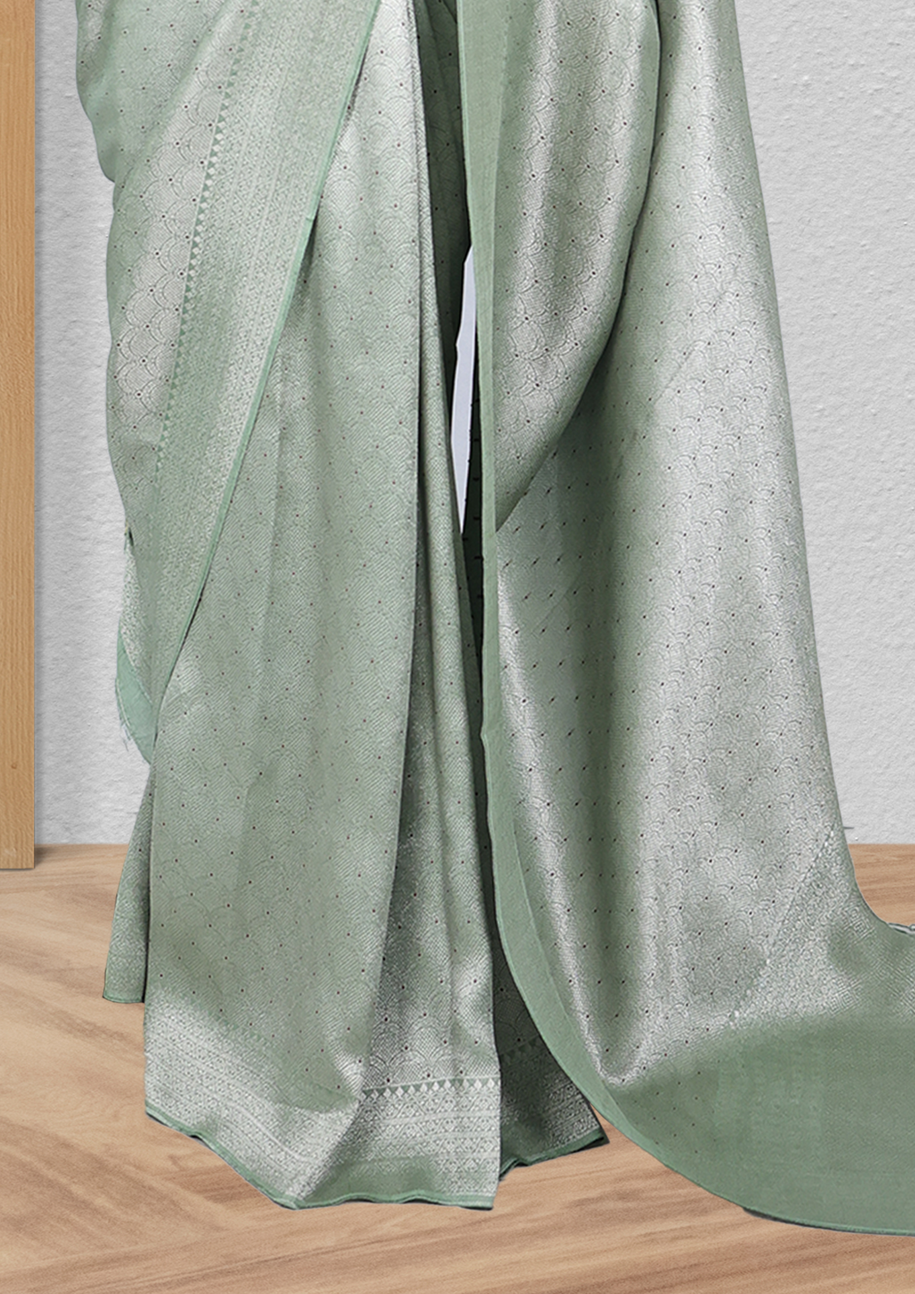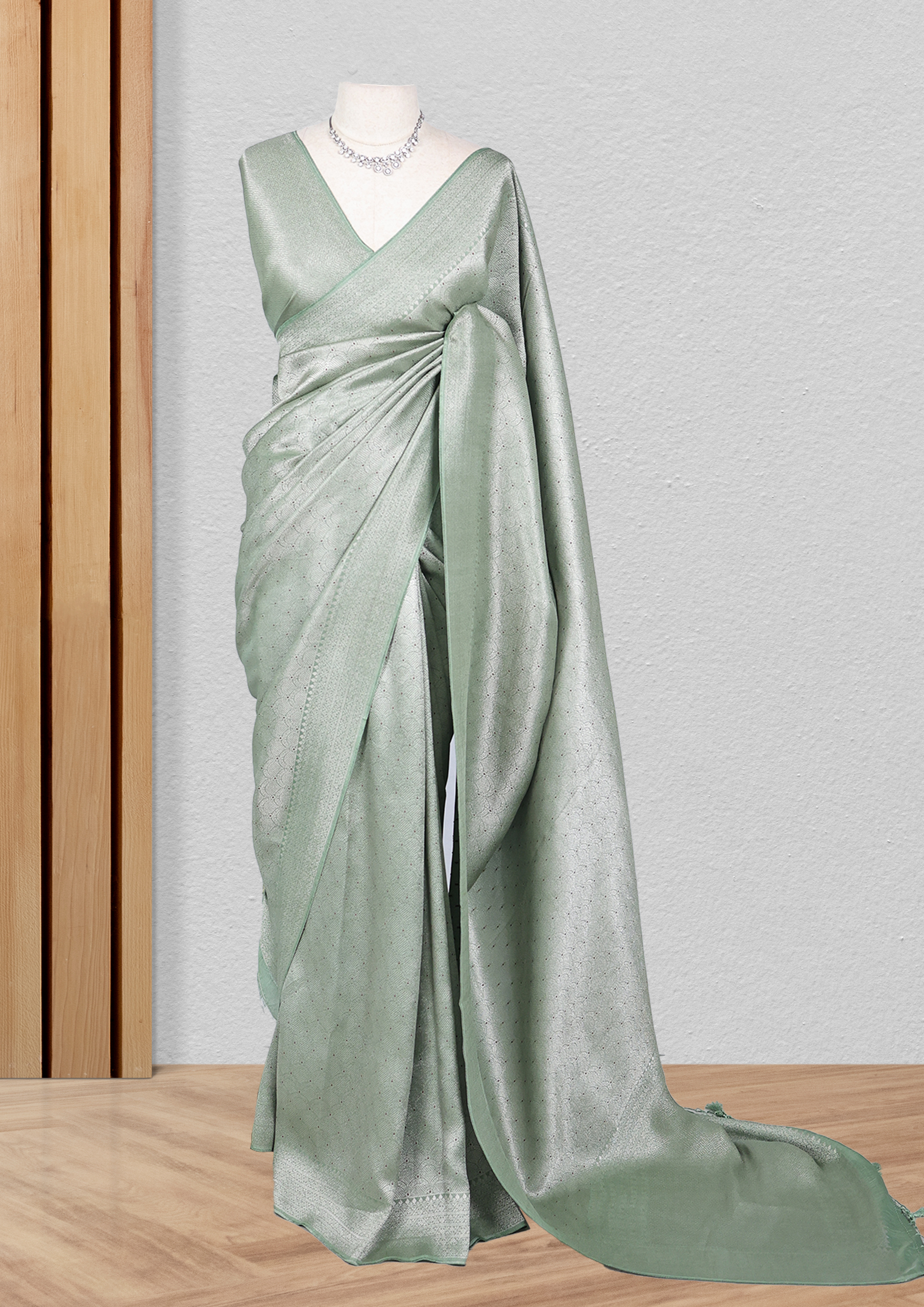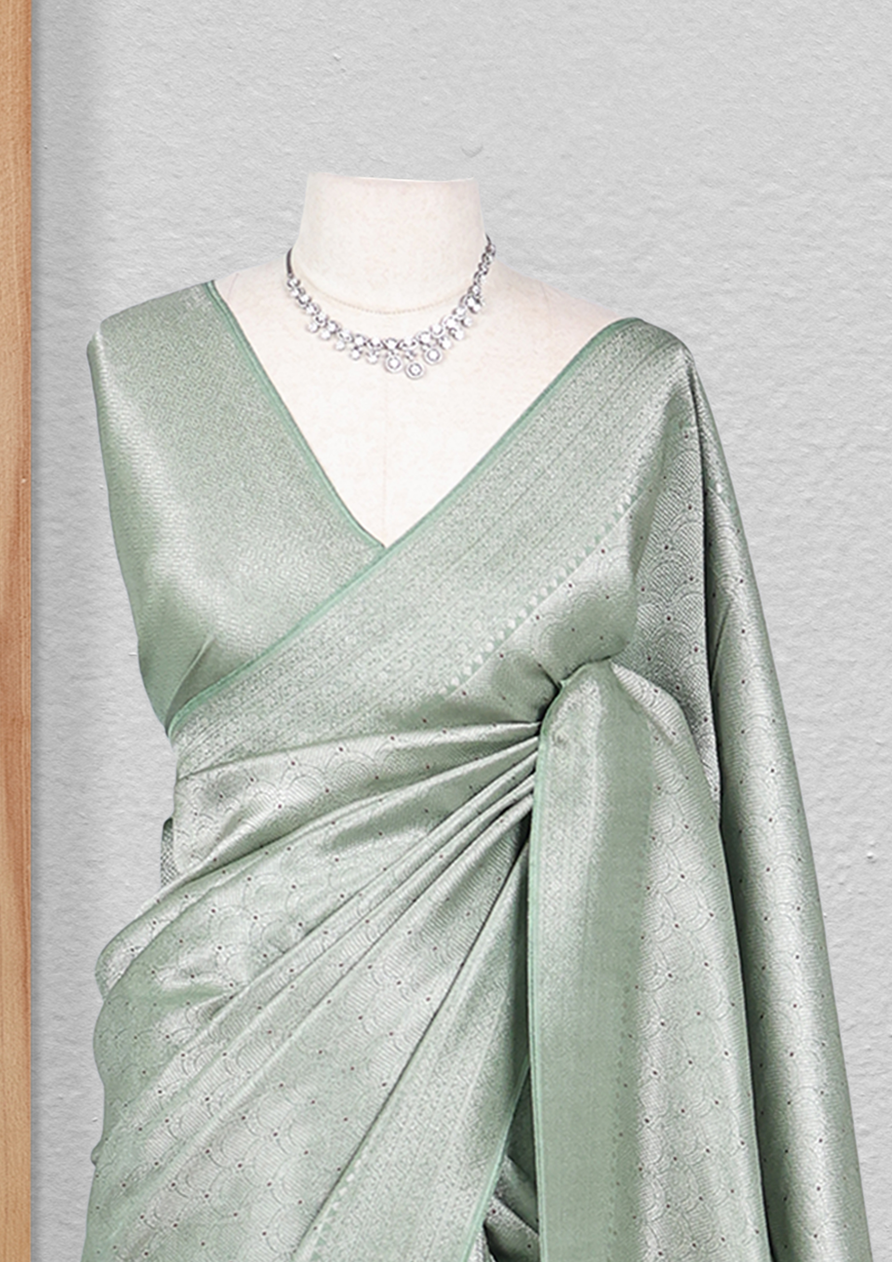 The saree itself boasts a stunning light green hue with an intricate pattern of overlapping floral motifs embossed across its fabric. Delicate red dots are scattered throughout, adding a touch of elegance. A green border with subtle embroidery adorns the top edge of the saree, enhancing its traditional appeal.