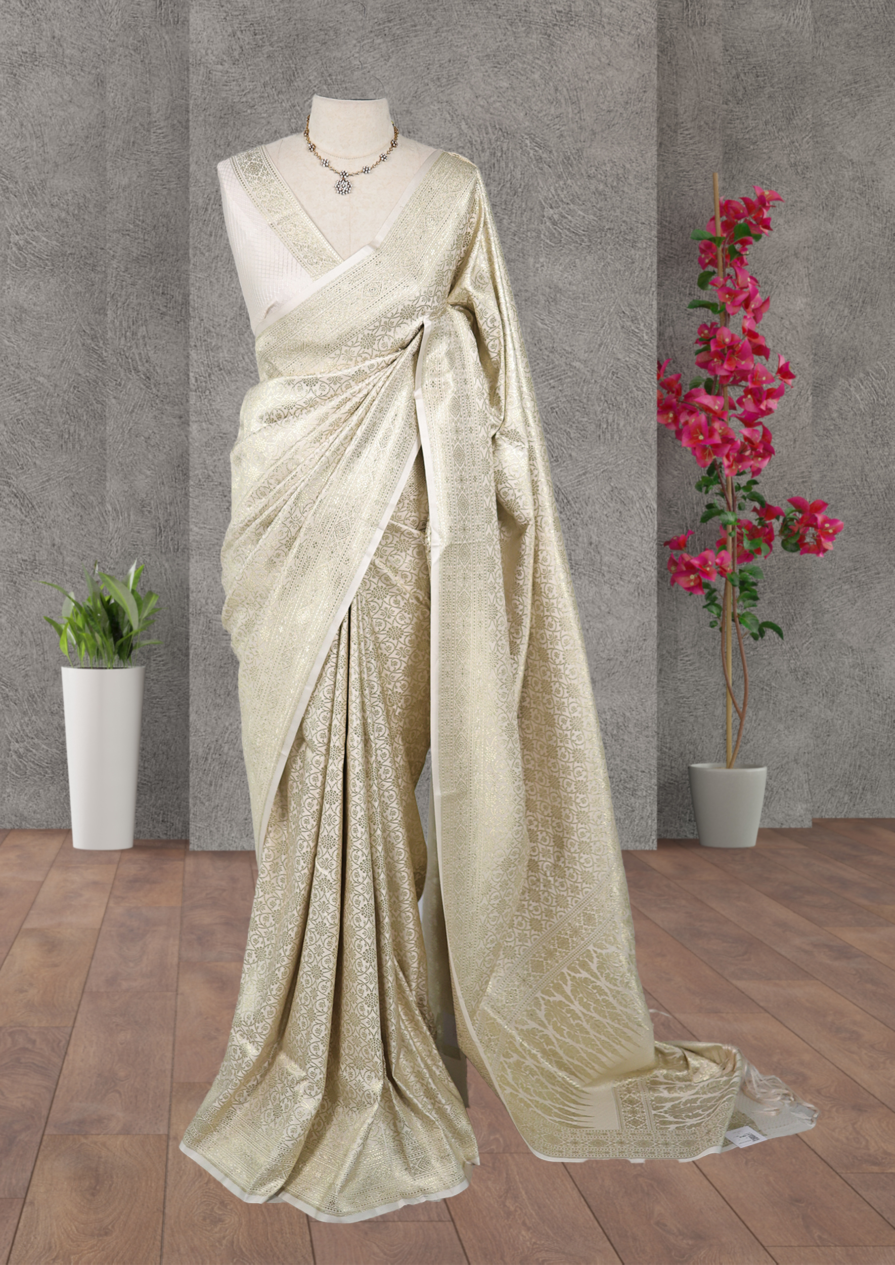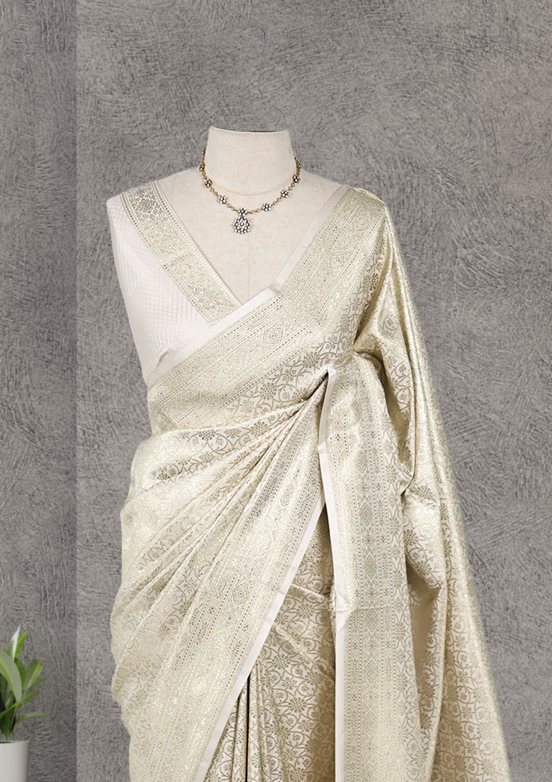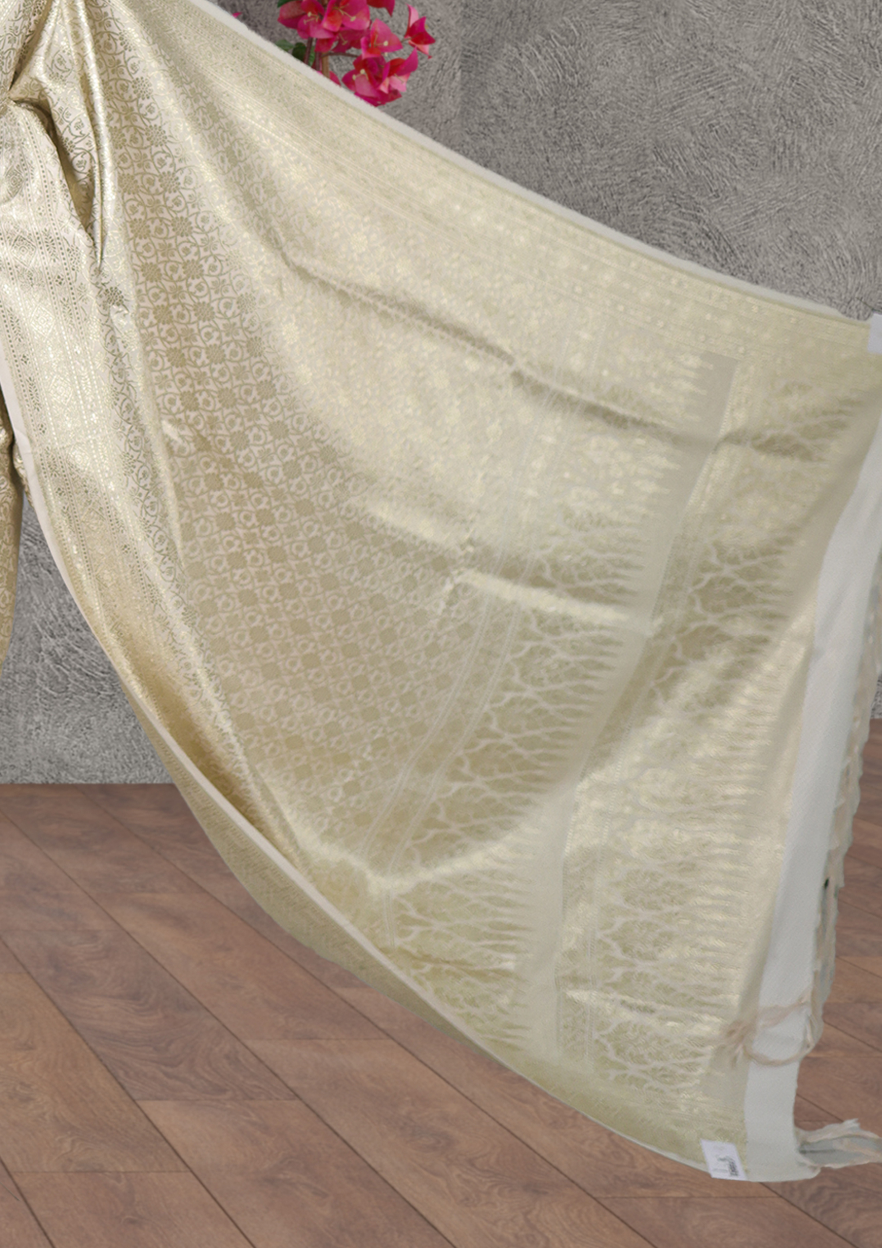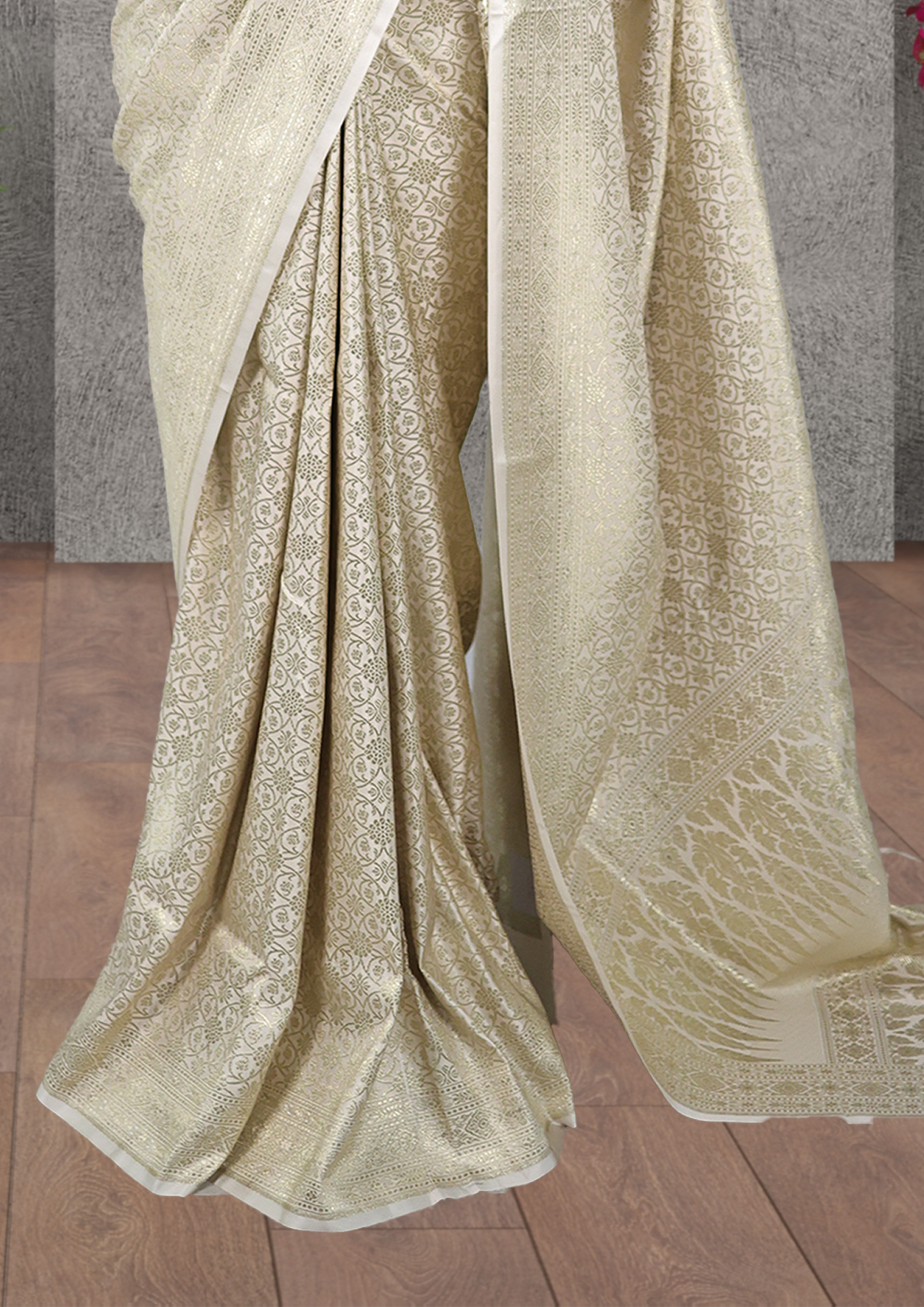 A close-up of a fabric, likely part of a saree, with intricate gold embroidery or zari work on a cream or off-white base. The fabric features a repeating pattern of floral motifs and vines in gold, creating a luxurious and traditional look.
