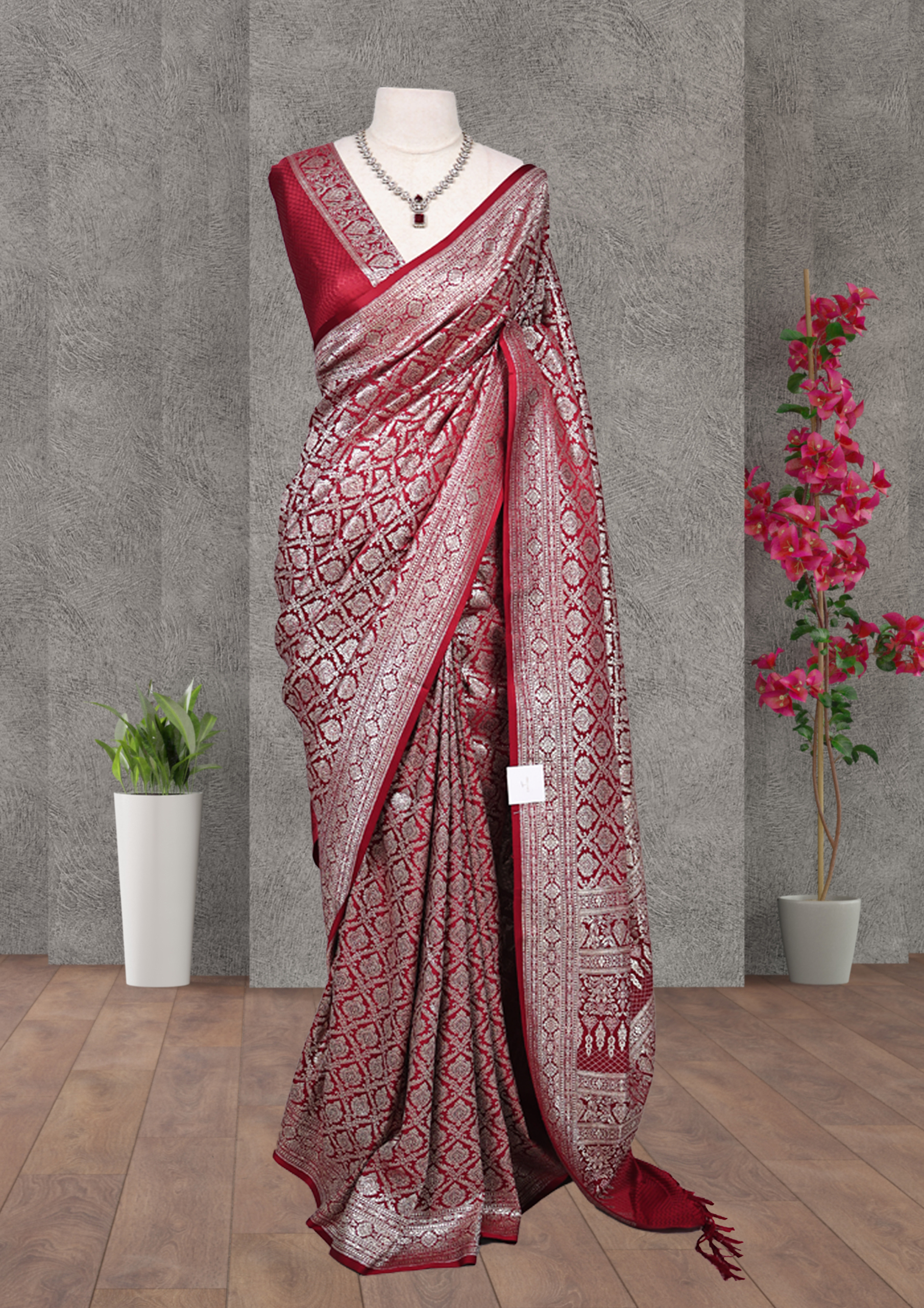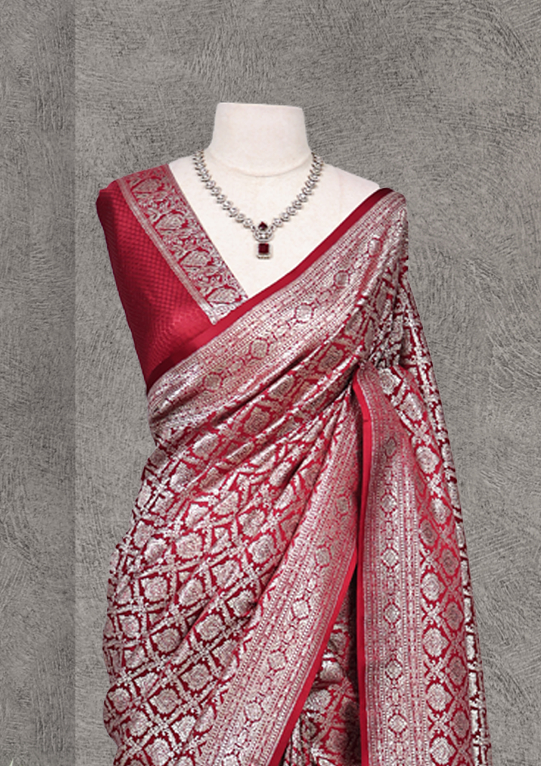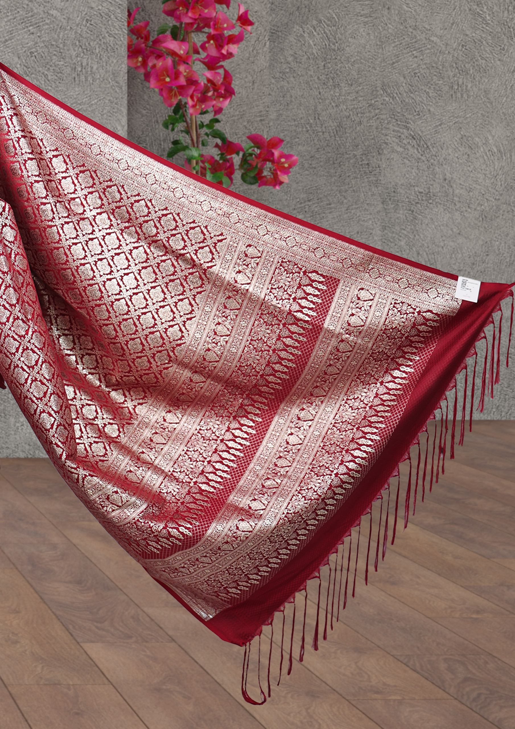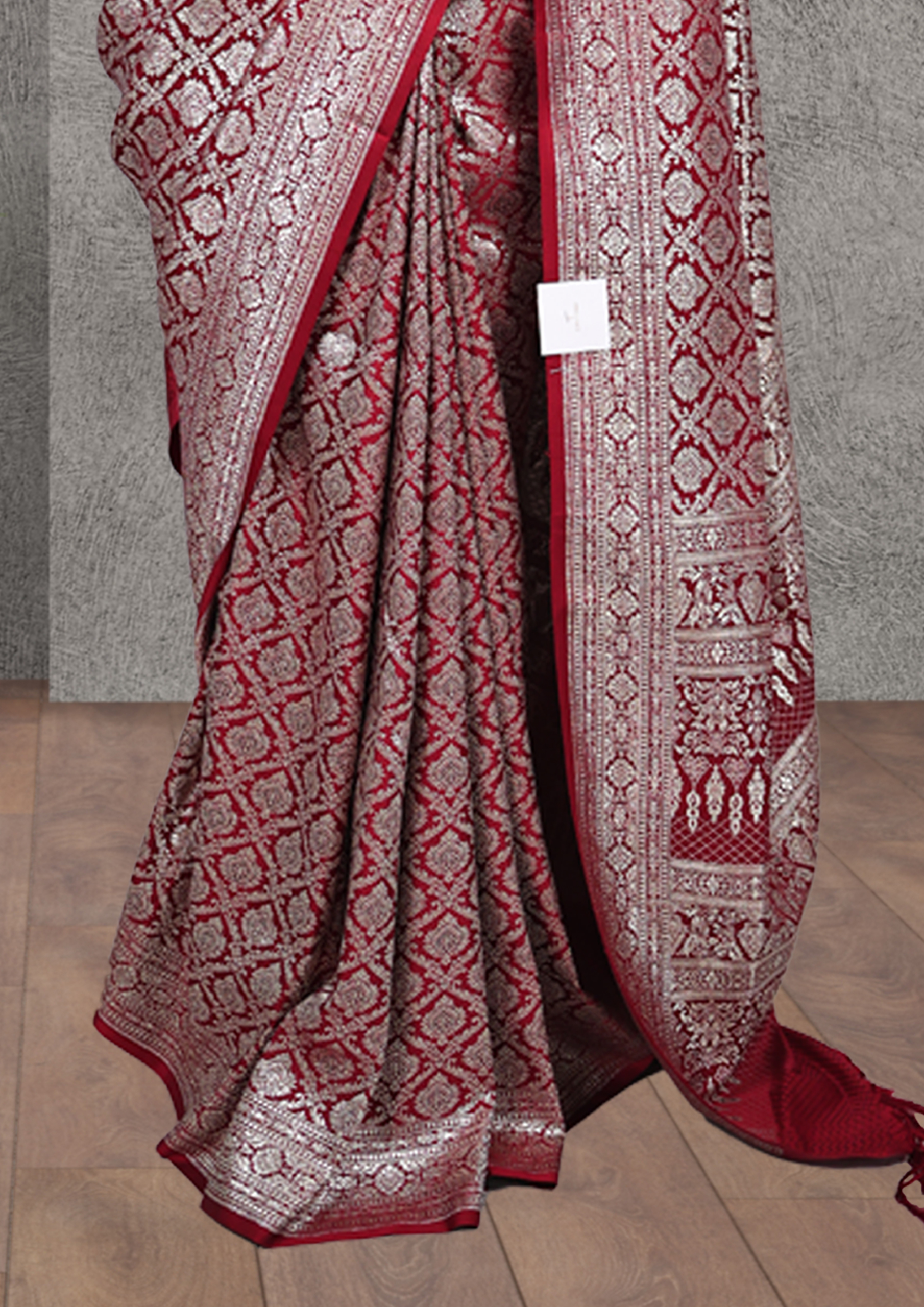 The saree features a rich red base with detailed gold designs, including floral motifs at the top and diamond-shaped patterns with leaf-like details below. The gold patterns are typical of traditional Indian textiles like Banarasi sarees, known for their opulent designs and use of zari work.