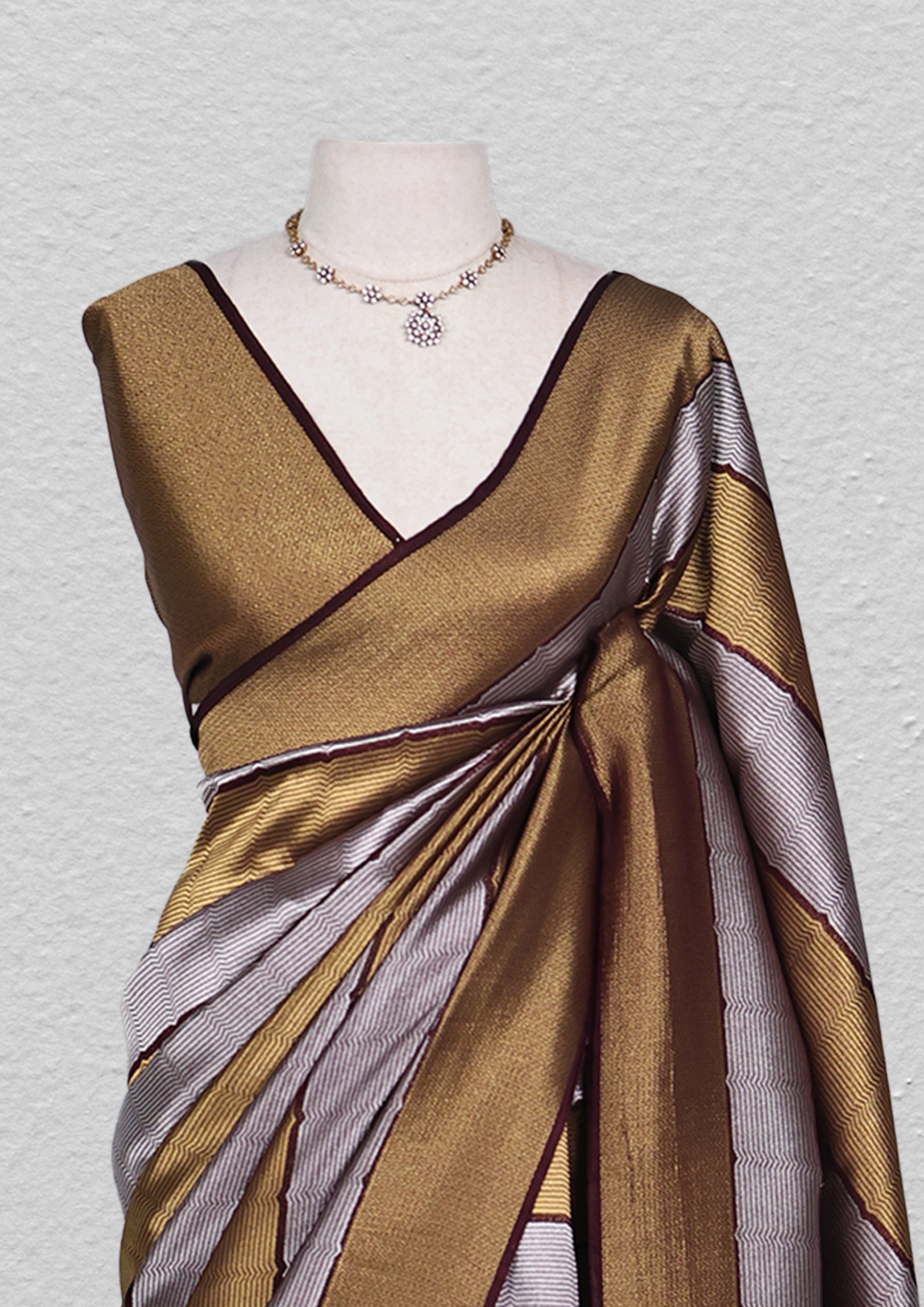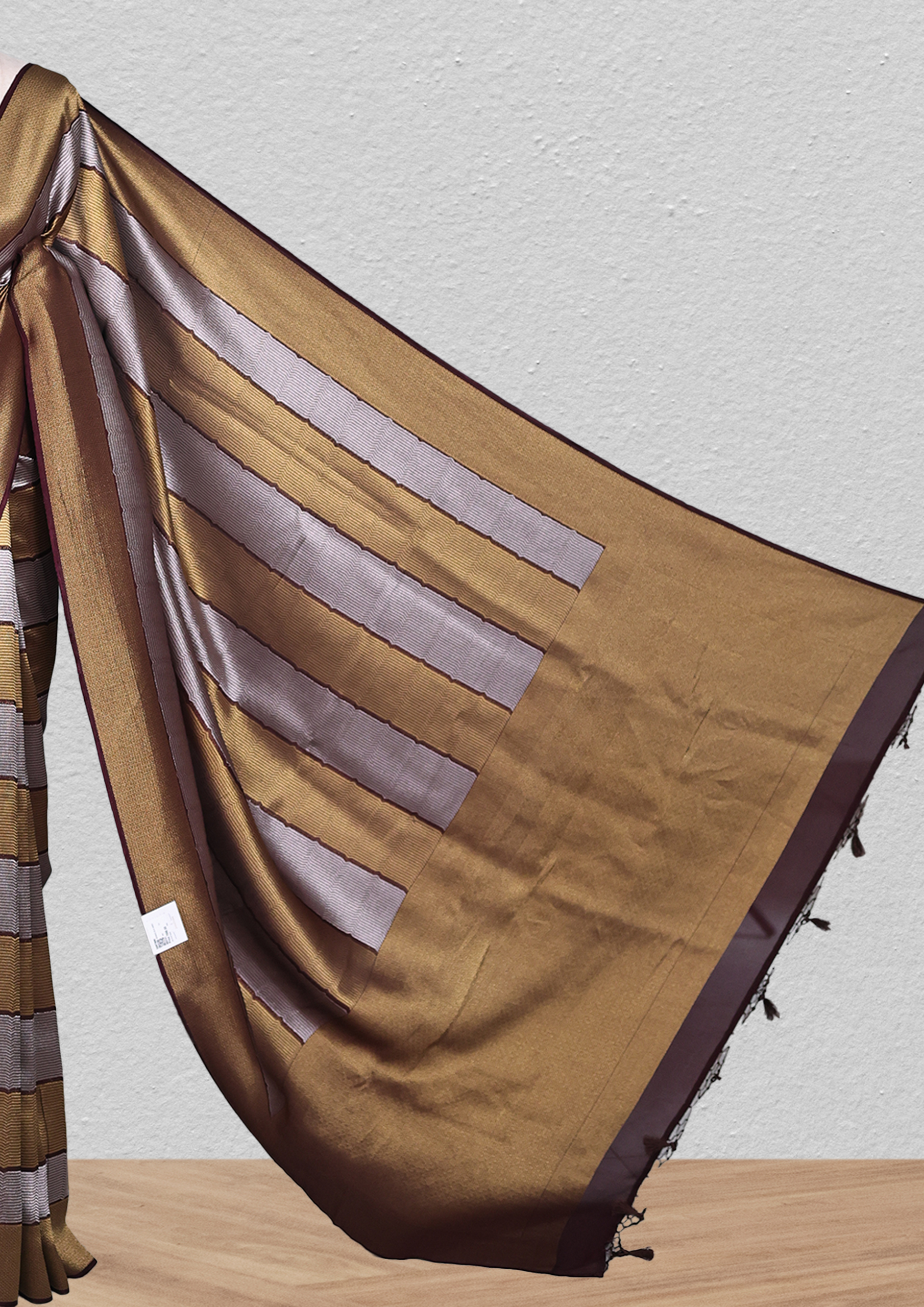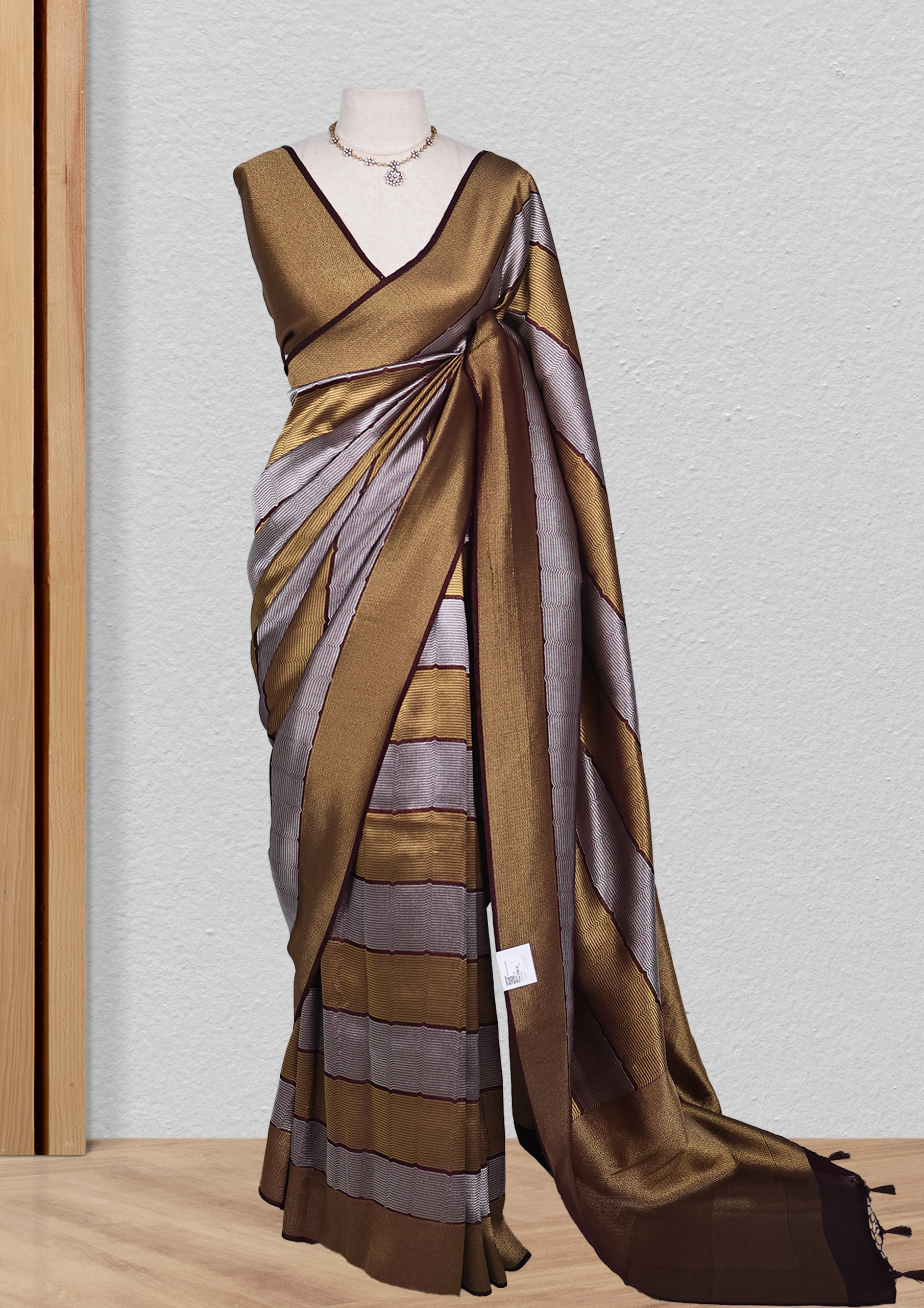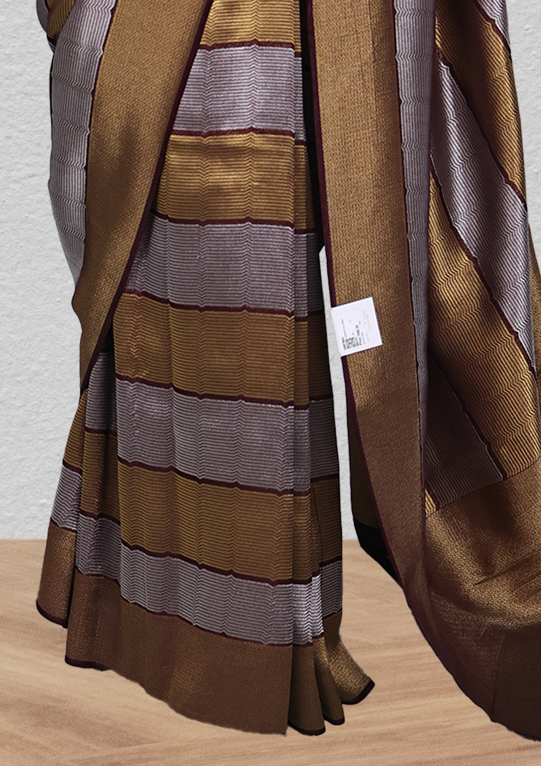 This saree boasts a striking striped pattern in a harmonious blend of earthy tones – mustard yellow, brown, grey, and navy blue. The stripes vary in width and are accentuated by zigzag lines that add a dynamic touch to the design. A navy blue border outlines each stripe, creating a crisp contrast against the textured fabric. The overall look is a fusion of traditional patterns with a contemporary aesthetic, making it a unique piece for saree enthusiasts.