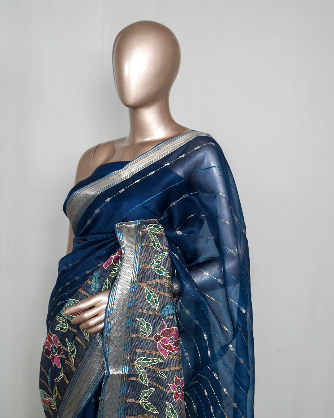 • Richly embroidered floral pallu